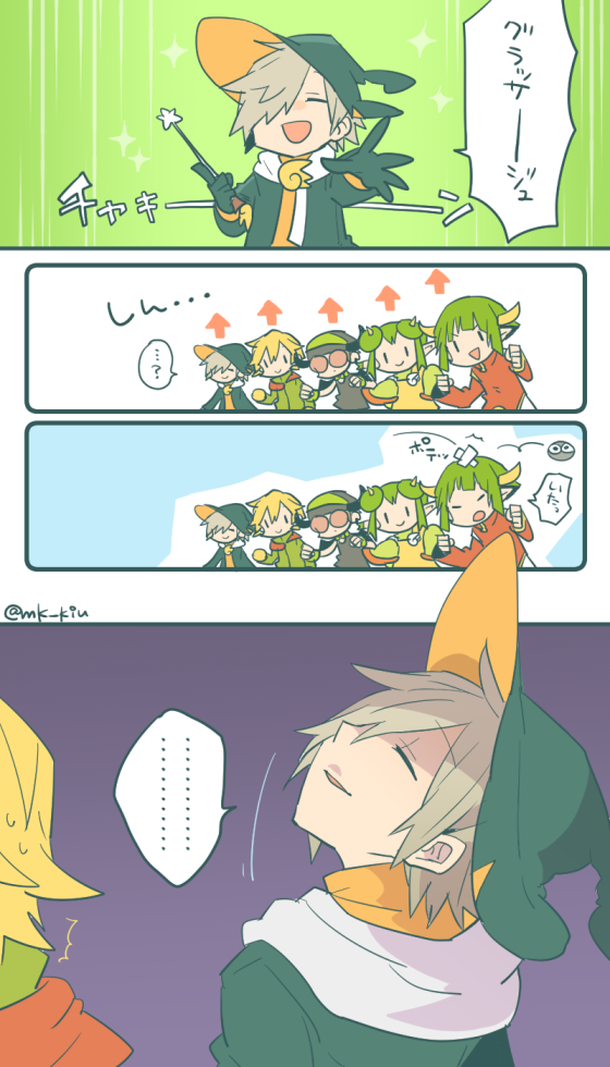2girls 3girls character_request closed_eyes draco_centauros green_hair grey_hair hat holding holding_wand lemres_(puyopuyo) lidelle_(puyopuyo) long_sleeves mk_kiu multiple_girls puyo_(puyopuyo) puyopuyo translation_request wand wizard_hat