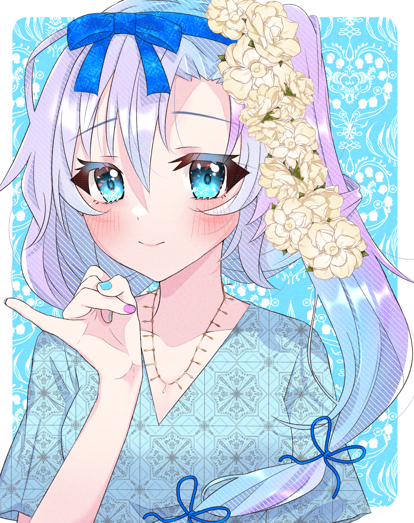 1girl alternate_costume blue_background blue_eyes blue_hair blue_nails blue_ribbon blue_shirt blush bow closed_mouth collarbone commentary_request eyelashes fingernails flower hair_between_eyes hair_bow hair_flower hair_ornament hair_ribbon highres jewelry kousetsu_samonji_(tenka_hyakken) light_blue_hair long_hair looking_at_viewer multicolored_nails nail_polish necklace parted_bangs pink_nails pinky_out print_shirt purple_nails ribbon shirt short_sleeves side_ponytail smile solo takimaro320 tenka_hyakken upper_body v-neck