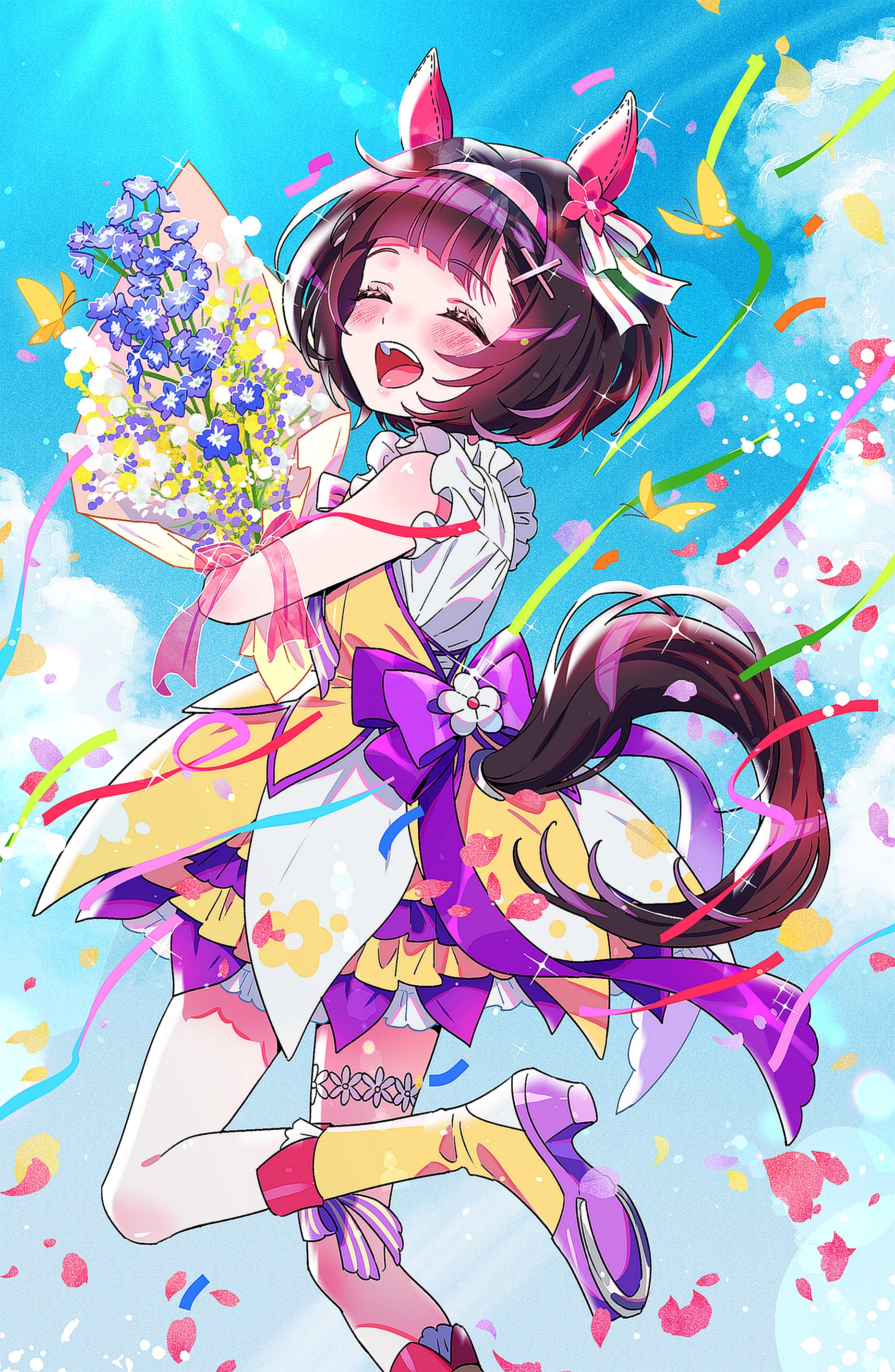 1girl absurdres animal_ears black_hair blue_sky blush boots bouquet bow brooch bug butterfly closed_eyes cloud dress ear_covers flower flower_brooch garter_belt headband highres holding holding_bouquet horse_ears horse_girl horse_tail insect jeonjagolhaem jewelry nishino_flower_(tiered_petal)_(umamusume) nishino_flower_(umamusume) open_mouth skirt sky solo tail umamusume