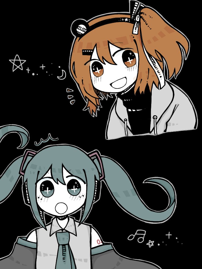 adachi_rei blue_hair brown_hair co8 hatsune_miku jacket musical_note necktie open_mouth surprised vocaloid