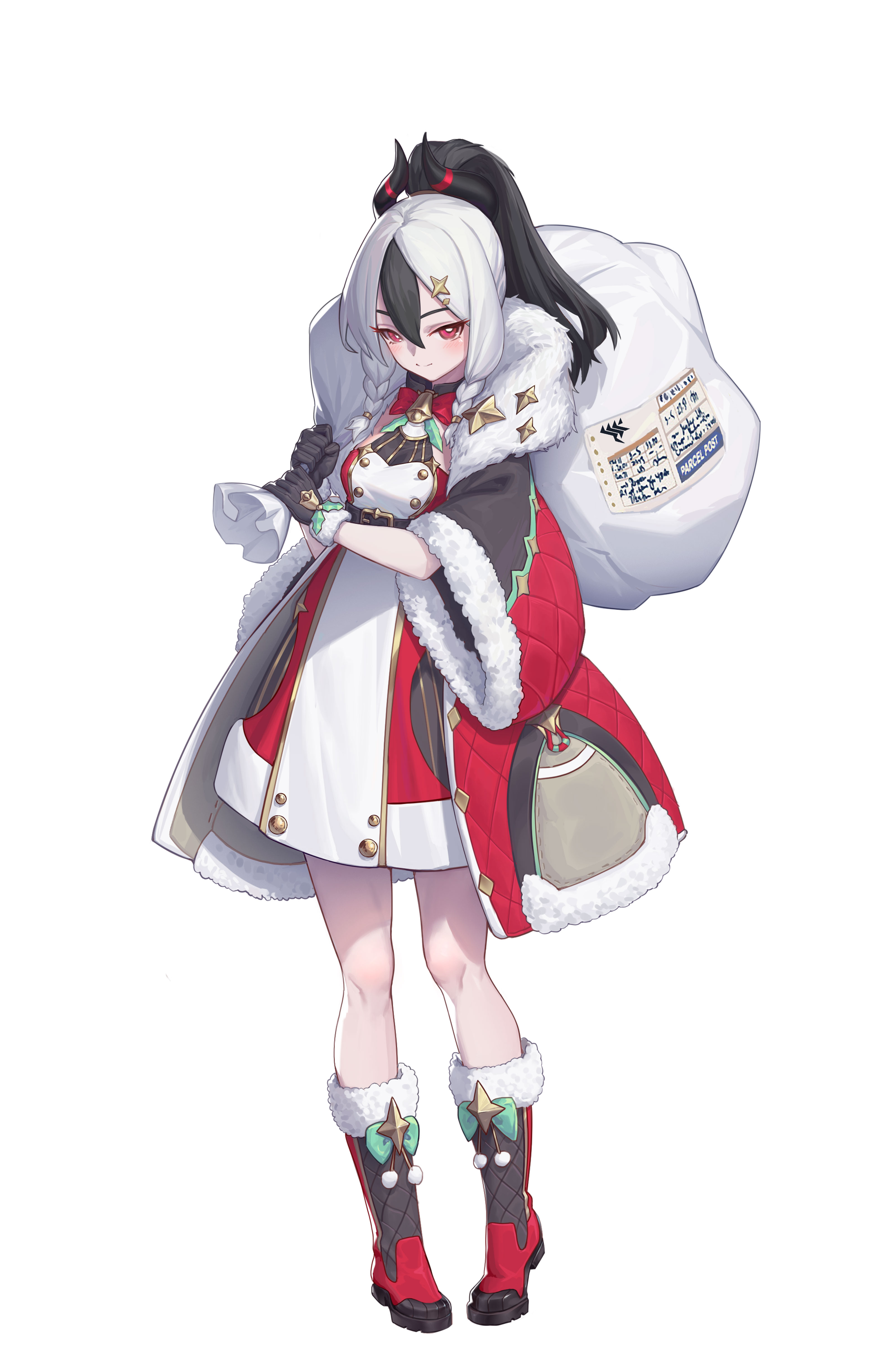 1girl absurdres alternate_costume bell belt black_gloves black_hair blue_archive blush boots bow bowtie braid breasts closed_mouth coat collar dress fur-trimmed_coat fur_trim gloves hair_between_eyes hair_ornament highres holding holding_sack horns kayoko_(blue_archive) long_hair long_sleeves looking_at_viewer multicolored_hair naezy_miao neck_bell open_clothes open_coat ponytail red_eyes sack simple_background sleeveless sleeveless_dress small_breasts smile solo standing two-tone_hair white_background white_hair wide_sleeves