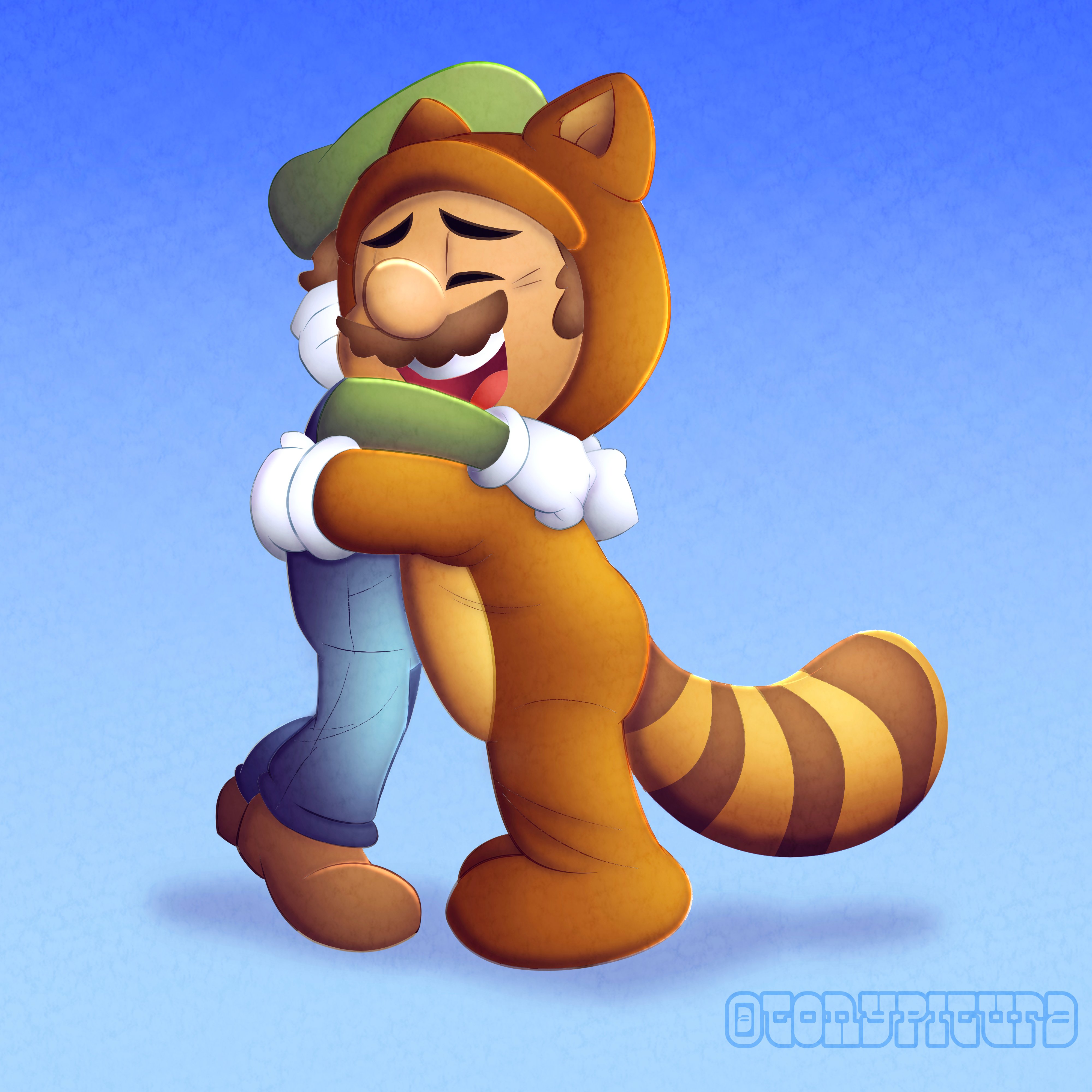 2boys absurdres brothers brown_hair closed_eyes facial_hair gloves grin hat highres hug luigi mario mario_(series) multiple_boys mustache nintendo overalls raccoon_mario raccoon_tail siblings smile tail tanooki_mario the_super_mario_bros._movie