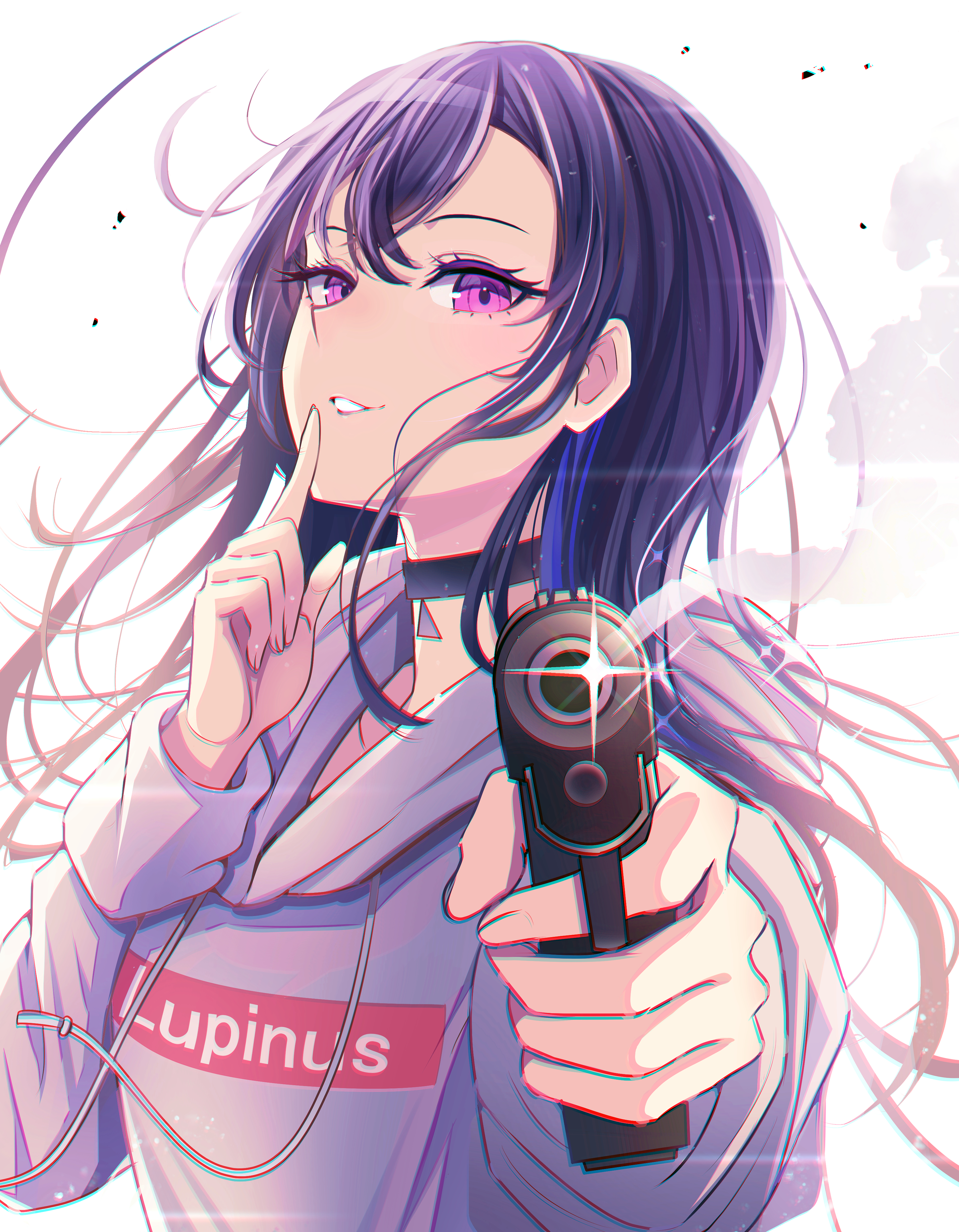 1girl absurdres aiming aiming_at_viewer black_choker black_hair blue_hair choker copyright_name crossed_bangs drawstring finger_to_mouth gun hair_between_eyes handgun highres holding holding_gun holding_weapon hood hood_down hoodie ichinose_uruha ichinose_uruha_(2nd_costume) index_finger_raised kiiro_(cocoa080) light_particles long_hair long_sleeves looking_at_viewer lupinus_virtual_games purple_eyes shushing simple_background smile smoke solo sparkle virtual_youtuber vspo! weapon white_background white_hoodie