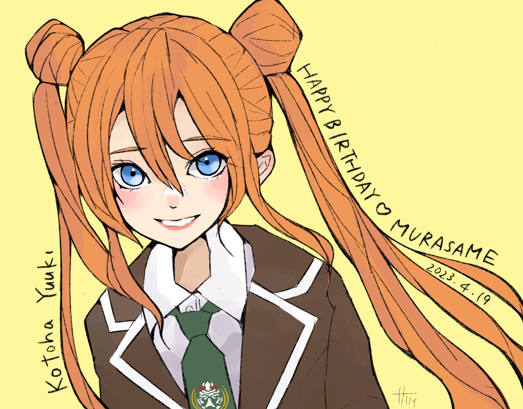 1girl arms_at_sides artist_name assault_lily black_jacket blue_eyes blush character_name collared_shirt commentary dated double_bun emblem green_necktie grin hair_between_eyes hair_bun happy_birthday heart highres jacket kusakabe_murasame long_bangs long_hair long_sleeves looking_at_viewer necktie orange_hair parted_lips sally_(allogkk) school_uniform shirt simple_background smile solo twintails upper_body white_shirt yellow_background