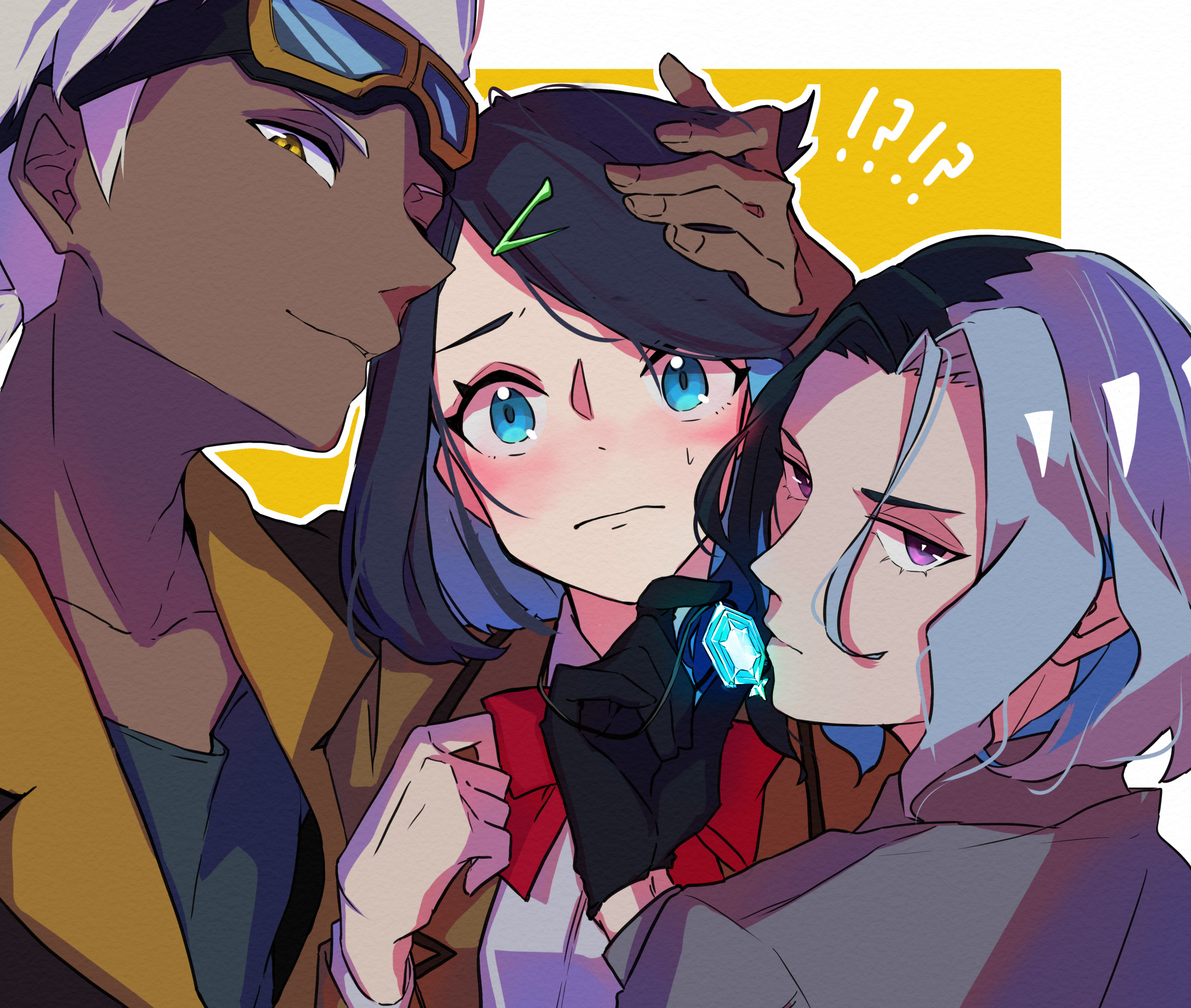 1girl 2boys amethio_(pokemon) aqua_eyes black_gloves black_hair blush bow bowtie boy_sandwich brown_jacket closed_mouth commentary_request dark-skinned_male dark_skin eyelashes friede_(pokemon) gloves goggles goggles_on_head grey_hair grey_jacket hair_ornament hairclip hand_on_another's_head highres jacket liko_(pokemon) looking_at_viewer multiple_boys nintendo nirugiri_(nirgy) outline pokemon pokemon_(anime) pokemon_horizons purple_eyes red_bow red_bowtie sandwiched school_uniform shirt upper_body yellow_eyes