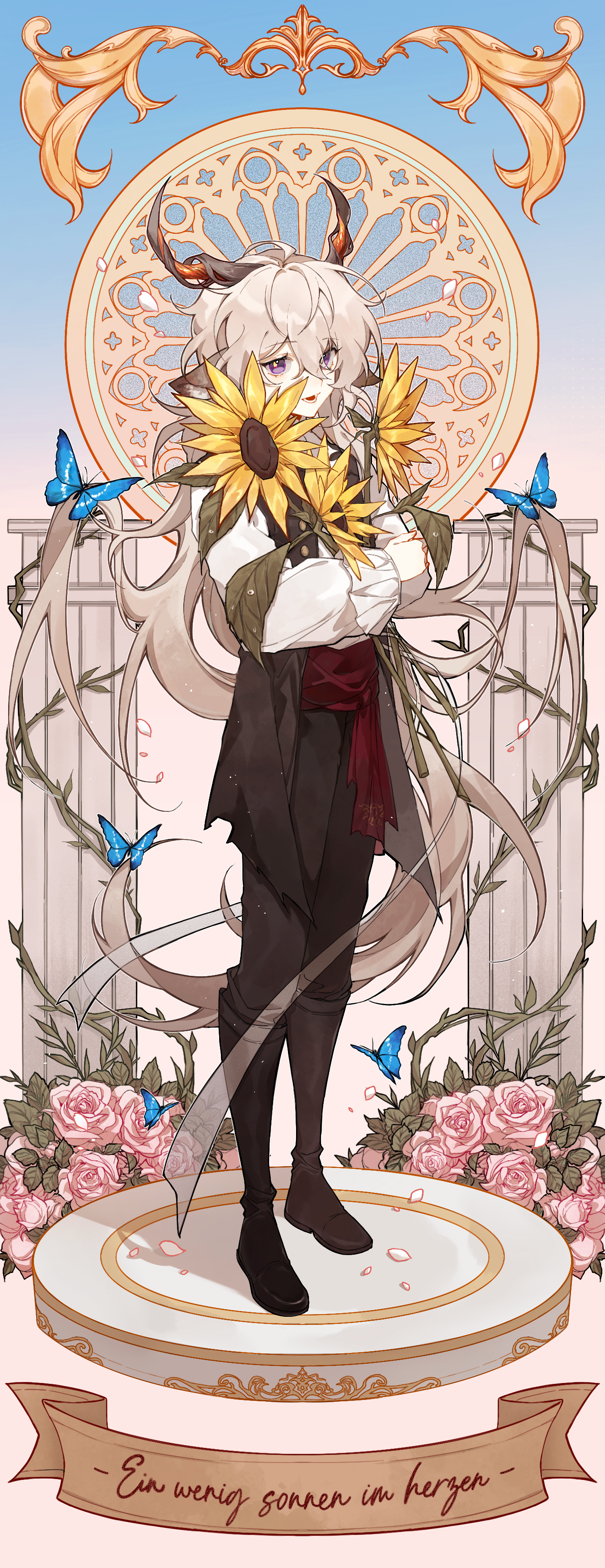 1boy :d absurdres animal_ears arknights black_boots black_pants black_vest blue_butterfly blush boots bug butterfly flower full_body german_text goat_boy goat_ears goat_horns hair_between_eyes highres holding holding_flower horns insect kreide_(arknights) leaf long_hair long_sleeves lower_teeth_only luna_(carrrlio) male_focus open_clothes open_mouth open_vest pants petals pink_flower pink_rose purple_eyes rose rose_petals shirt smile solo sunflower teeth translated typo very_long_hair vest white_hair white_shirt yellow_flower