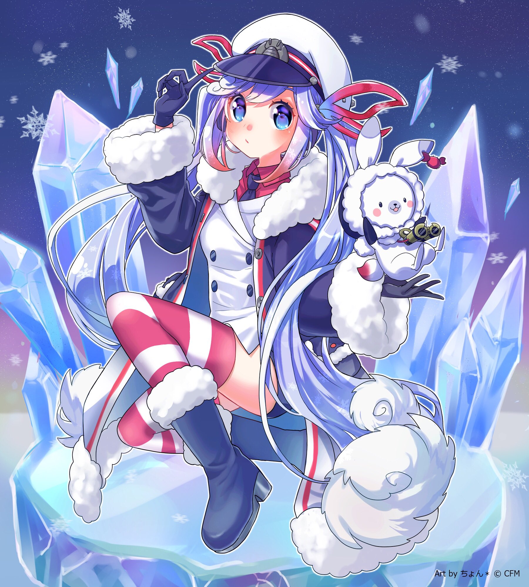 1girl artist_name black_footwear black_gloves blue_eyes blue_hair boots closed_mouth colorized commentary copyright_notice crystal daopon derivative_work full_body fur_trim gloves hat hatsune_miku high_heel_boots high_heels highres ice long_hair long_sleeves looking_at_viewer nurimas peaked_cap rabbit_yukine red_thighhighs snowflakes striped_clothes striped_thighhighs thighhighs twintails vocaloid white_headwear white_thighhighs yuki_miku yuki_miku_(2022)