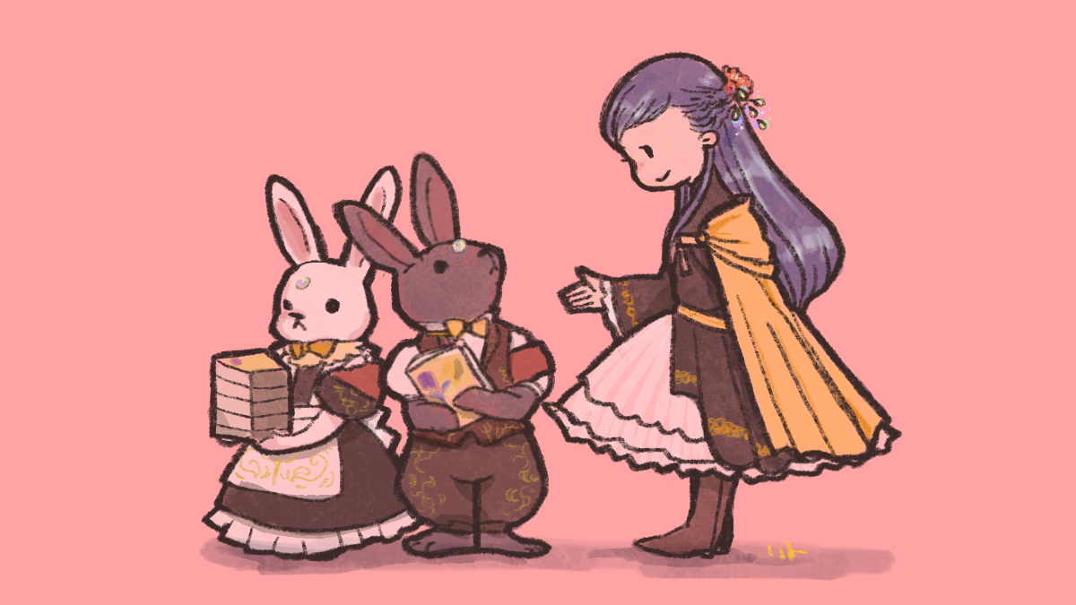 1girl black_eyes blue_hair book book_stack bow braid brown_footwear brown_pants cape dress flower forehead_jewel gem hair_flower hair_ornament holding holding_book honzuki_no_gekokujou ling_samsam long_hair maid myne_(honzuki_no_gekokujou) pants pink_background rabbit red_flower side_cape smile solid_oval_eyes swept_bangs vest yellow_bow yellow_cape