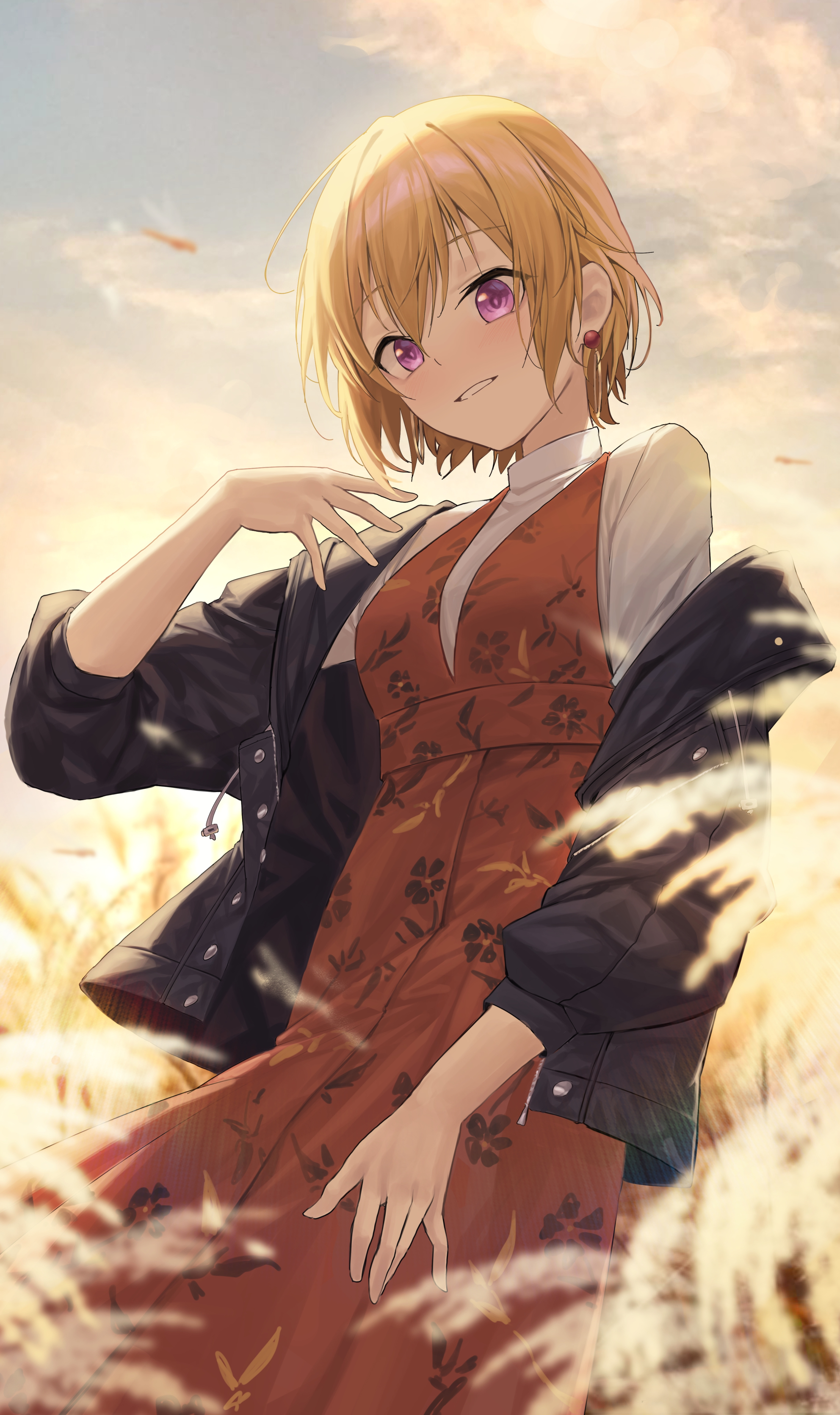 1girl absurdres black_jacket blonde_hair blurry blurry_foreground blush breasts depth_of_field dress earrings floral_print highres idolmaster idolmaster_shiny_colors jacket jacket_partially_removed jewelry looking_at_viewer mansu_(mansu113355) outdoors pinafore_dress purple_eyes saijo_juri short_hair sleeveless sleeveless_dress small_breasts smile solo
