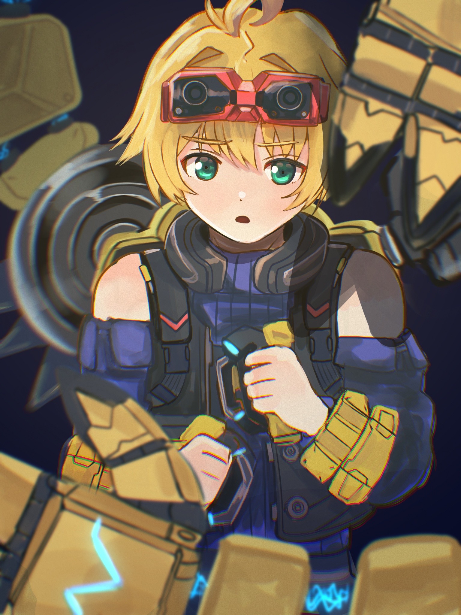 1boy ahoge aqua_eyes bare_shoulders black_vest blonde_hair blue_shirt blue_sleeves chromatic_aberration d: detached_sleeves goggles goggles_on_head hair_intakes highres long_sleeves looking_at_viewer male_focus mechanical_arms nikol_(xenoblade) open_clothes open_mouth open_vest ribbed_shirt shirt short_hair solo tochiryo turtleneck vest xenoblade_chronicles_(series) xenoblade_chronicles_3 xenoblade_chronicles_3:_future_redeemed