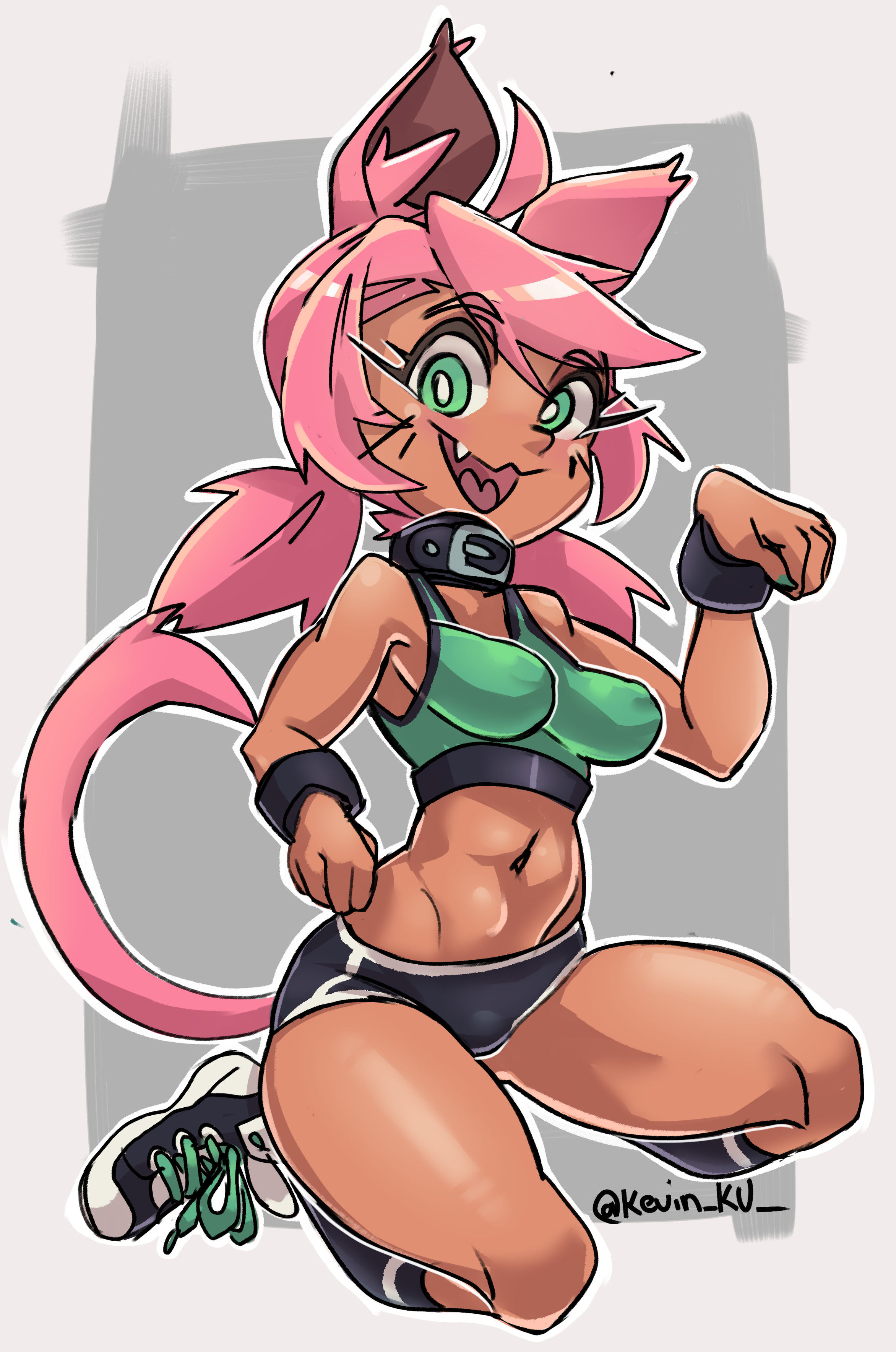 1girl absurdres animal_ears breasts cat_ears cat_girl cat_tail colored_skin dark-skinned_female dark_skin fingernails full_body furry furry_female green_eyes gym_uniform highres kevin_ku kneeling large_breasts looking_at_viewer low_twintails navel nikki_(kevin_ku) open_mouth original paw_pose shiny_skin short_hair short_shorts shorts simple_background smile solo tail twintails wide_hips