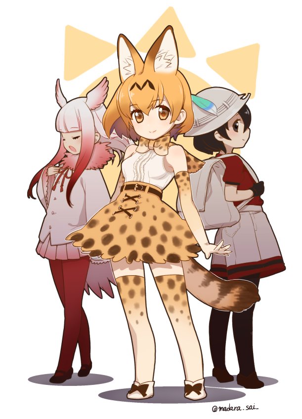 3girls animal_ear_fluff animal_ears animal_print backpack bag bare_shoulders bird_tail black_eyes black_gloves black_hair black_pantyhose blonde_hair blunt_bangs bow bowtie breasts center_frills closed_eyes commentary_request elbow_gloves extra_ears frills full_body fur_collar gloves gradient_hair hair_between_eyes hat hat_feather head_wings high-waist_skirt japanese_crested_ibis_(kemono_friends) kaban_(kemono_friends) kemono_friends long_hair looking_at_viewer madara_sai miniskirt multicolored_hair multiple_girls open_mouth pantyhose pink_skirt pleated_skirt print_bow print_bowtie print_gloves print_legwear print_skirt print_thighhighs red_hair red_pantyhose red_shirt serval_(kemono_friends) shirt short_hair shorts simple_background skirt sleeveless sleeveless_shirt small_breasts smile tail thighhighs twitter_username white_background white_hair white_headwear white_shirt white_shorts wide_sleeves wings yellow_eyes zettai_ryouiki
