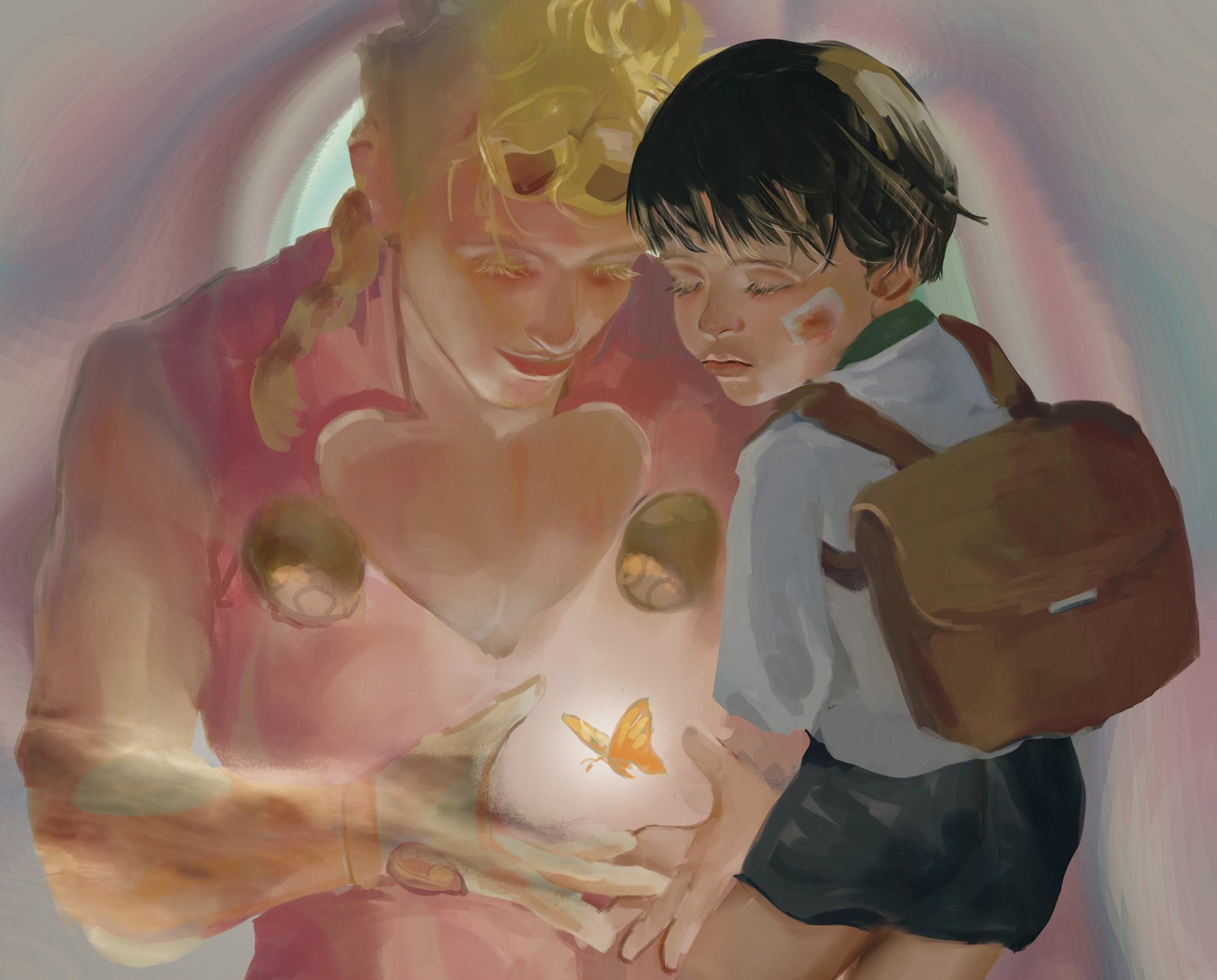 2boys aged_down backpack bag bandage_on_face bandages black_hair blonde_hair braid bug butterfly commentary_request danart14020 dual_persona eyelashes giorno_giovanna gold_experience haruno_shiobana highres insect jacket jojo_no_kimyou_na_bouken lips long_hair long_sleeves male_focus multiple_boys pink_jacket realistic shirt short_hair shorts smile stand_(jojo) vento_aureo white_shirt