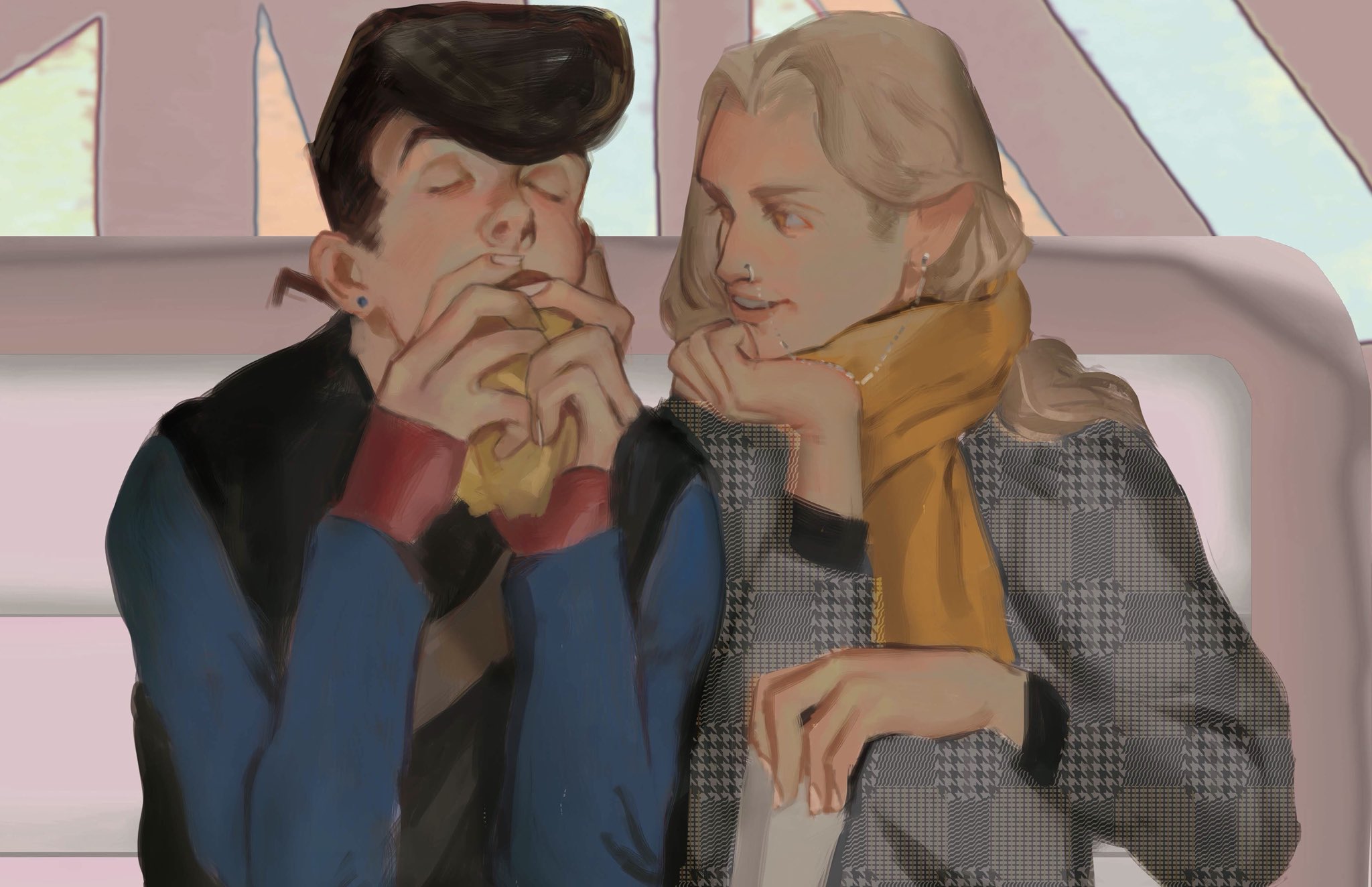 2boys black_hair blonde_hair closed_eyes commentary_request danart14020 diamond_wa_kudakenai earrings eyelashes face_piercing hair_slicked_back hazekura_mikitaka higashikata_josuke highres holding jewelry jojo_no_kimyou_na_bouken lips long_hair long_sleeves looking_at_another male_focus multiple_boys nose_piercing orange_scarf piercing pointy_ears pompadour realistic scarf smile sweater teeth