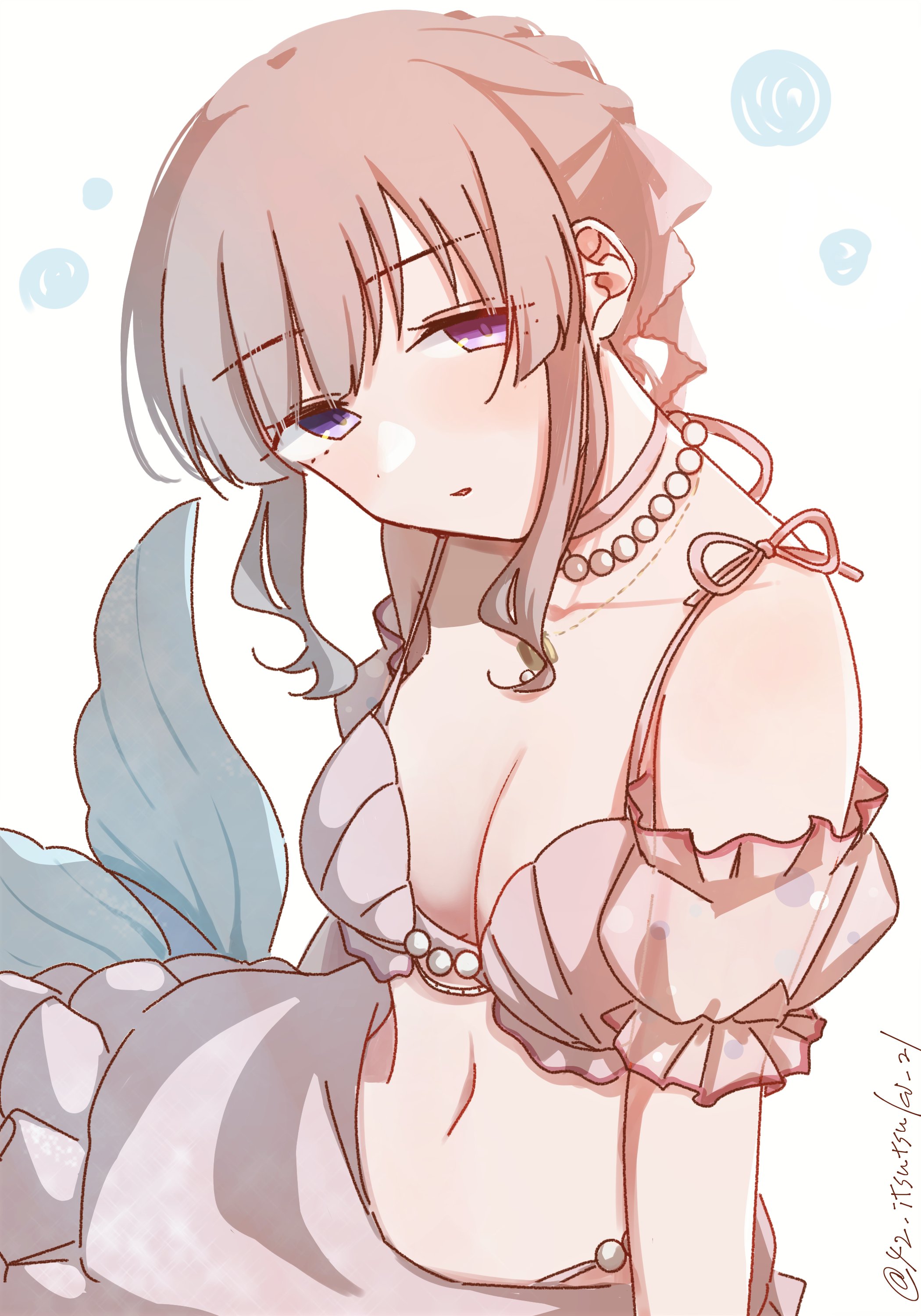 1girl 42_itsutsuki_21 absurdres bikini blue_tail breasts choker cleavage expressionless grey_hair highres idolmaster idolmaster_shiny_colors jewelry looking_at_viewer medium_breasts mermaid monster_girl necklace pearl_necklace ponytail purple_eyes sarong shell shell_bikini sidelocks sitting sketch solo swimsuit twitter_username white_background yokozuwari yukoku_kiriko
