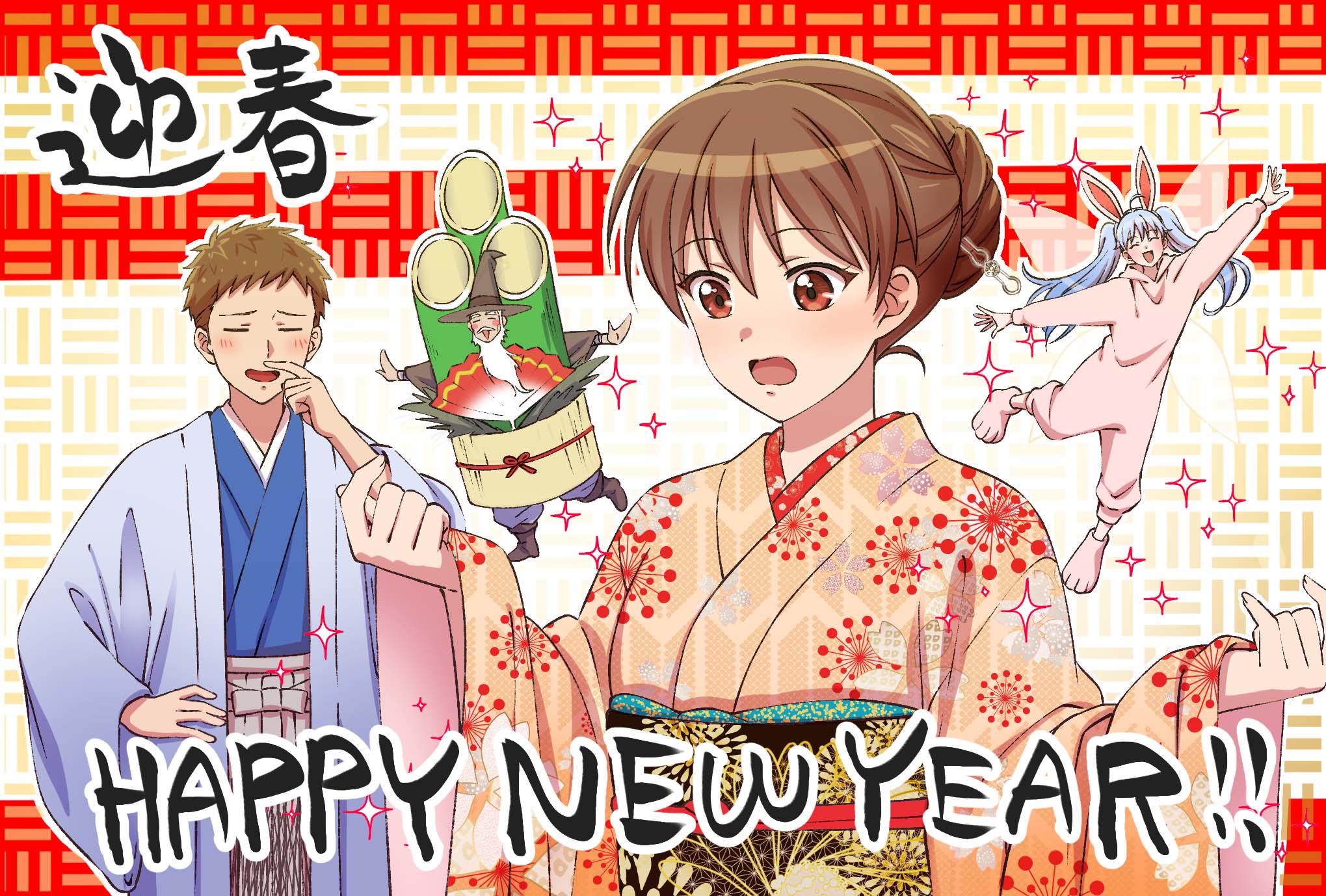 2boys 2girls beard benriya_saitou-san_isekai_ni_iku blue_coat blue_kimono blush braid braided_bun brown_eyes brown_hair brown_headwear coat confused english_text facial_hair fairy fairy_wings grey_pants hair_behind_ear hair_bun hakama hakama_pants hand_on_own_hip happi happy_new_year hat highres japanese_clothes kimono lafanpan mini_person miniboy minigirl morlock_(benriya_saitou-san) multiple_boys multiple_girls new_year obi official_art open_mouth orange_kimono pants raelza_(benriya_saitou-san) saitou_(benriya_saitou-san) sash single_hair_bun smile sparkle tanabe_youko twintails wings wizard_hat