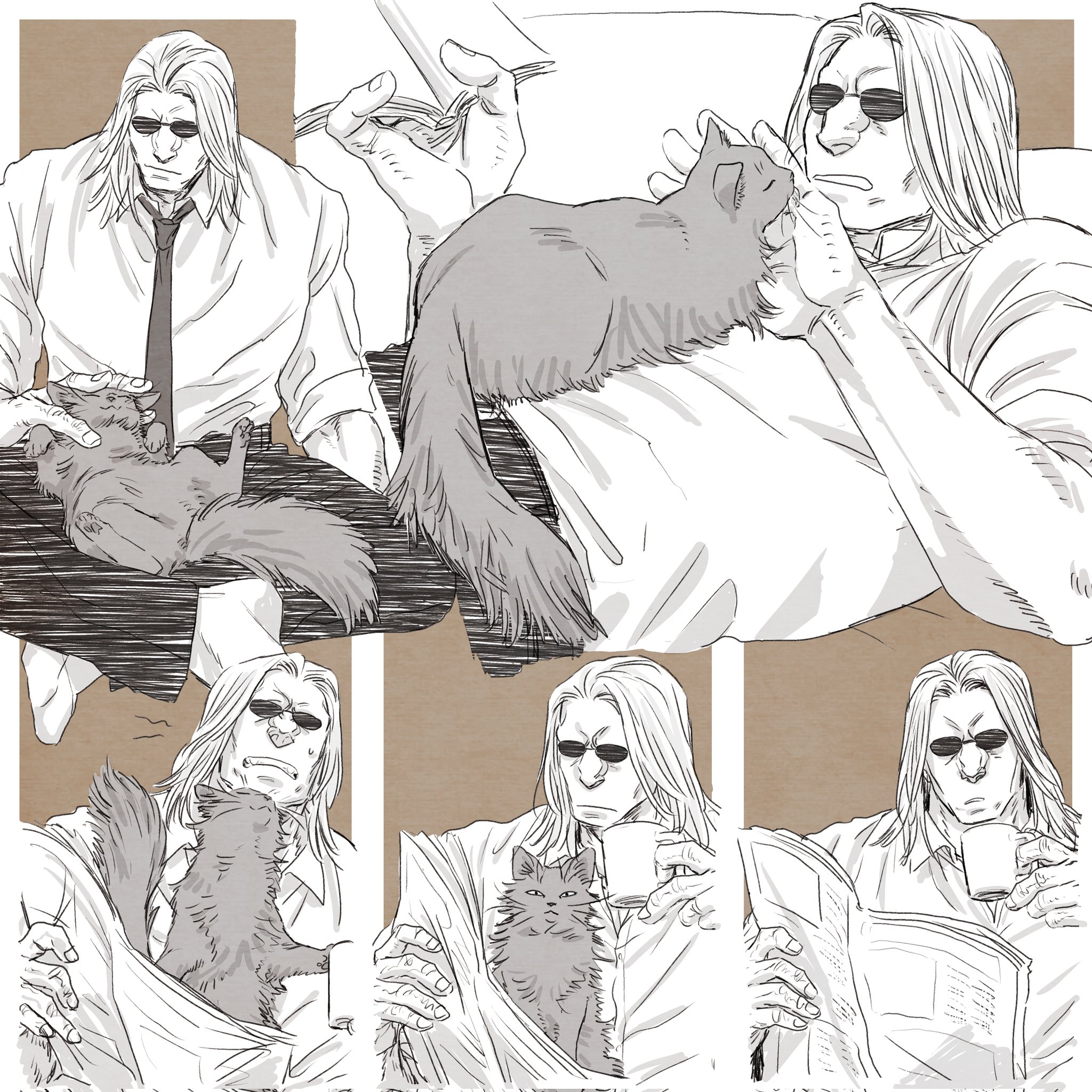 1boy black_pants cat cup highres holding holding_cup holding_newspaper hunter_x_hunter long_hair lying male_focus morel_mackernasey muscular muscular_male necktie newspaper nkwtsrsk_hh on_bed pants patting reading shirt sitting solo sunglasses white_hair white_shirt