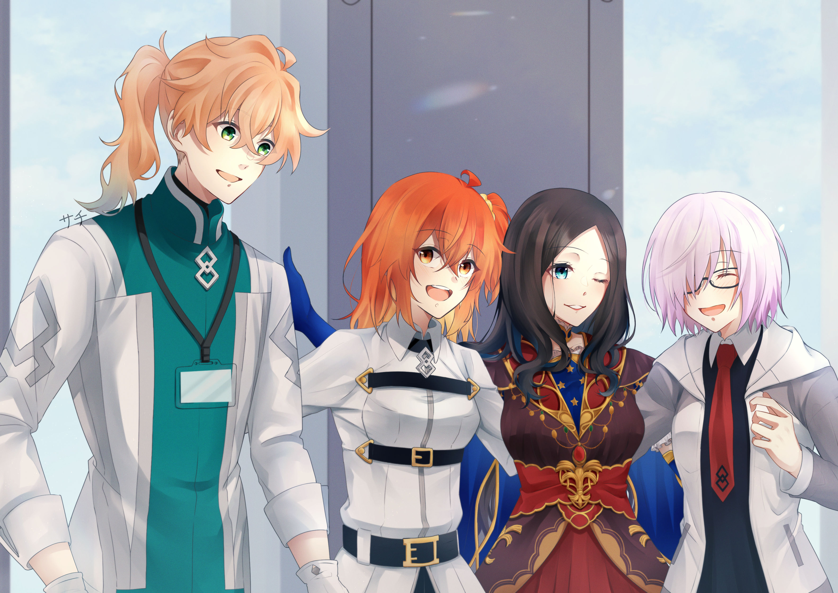1boy 3girls absurdres ahoge aqua_eyes belt belt_buckle black-framed_eyewear black_belt black_dress blue_gloves brown_dress buckle chaldea_uniform closed_eyes collared_dress commentary_request crossed_bangs dress elbow_gloves fate/grand_order fate_(series) fujimaru_ritsuka_(female) glasses gloves grey_jacket hair_between_eyes hair_ornament hair_scrunchie highres hood hood_down hooded_jacket id_card indoors jacket lab_coat leonardo_da_vinci_(caster)_(fate) leonardo_da_vinci_(fate) long_hair long_sleeves mash_kyrielight messy_hair multicolored_jacket multiple_girls necktie open_mouth orange_eyes orange_hair ponytail red_necktie romani_archaman sati129_no scrunchie short_hair side_ponytail teeth two-tone_jacket upper_teeth_only white_gloves white_jacket yellow_scrunchie