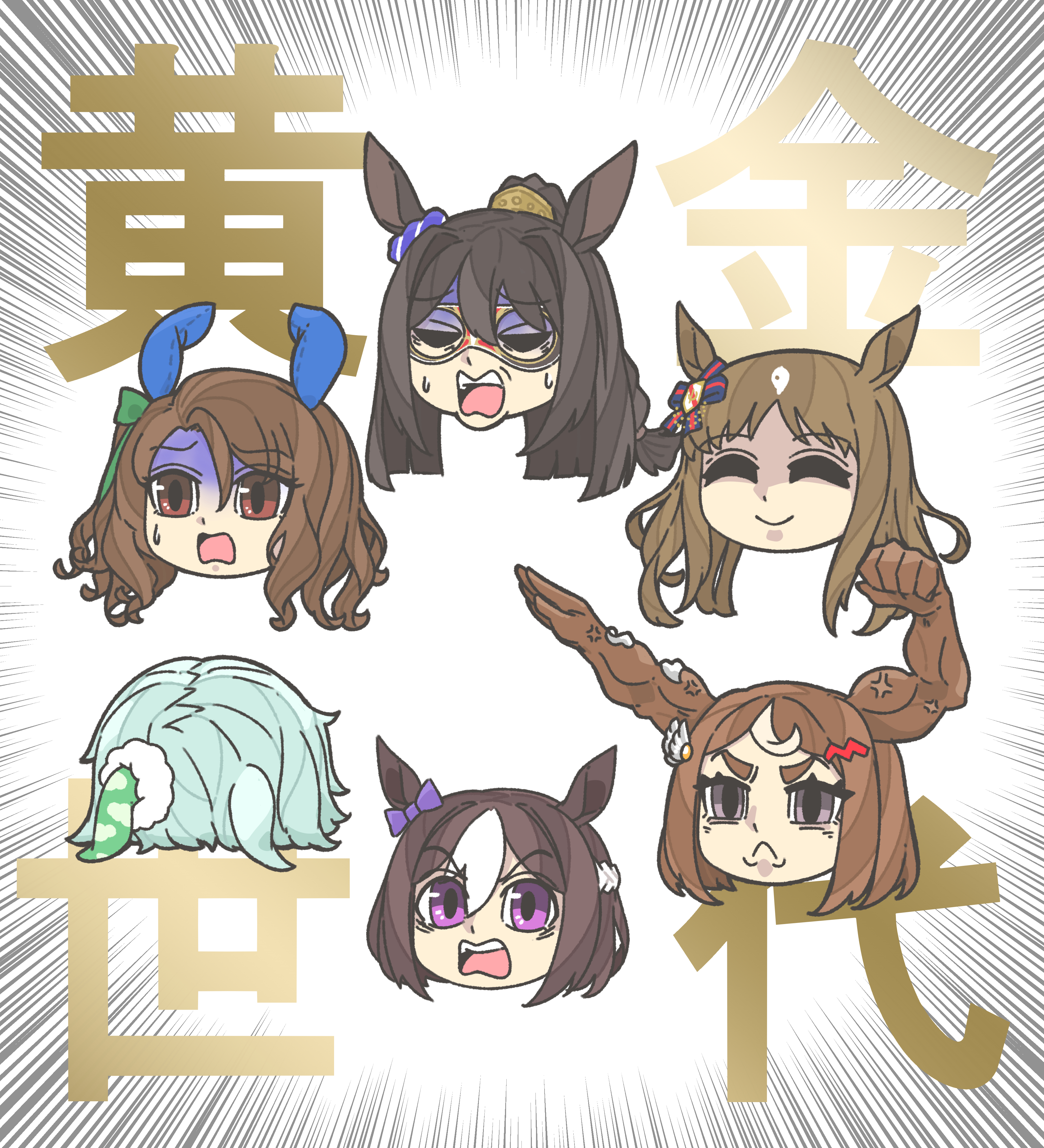 6+girls :< ^_^ absurdres agemasen!_(meme) animal_ears bow brown_hair closed_eyes domino_mask ear_bow ear_covers ear_scrunchie el_condor_pasa_(umamusume) emphasis_lines eye_mask false_smile flower gloom_(expression) golden_generation_(umamusume) grass_wonder_(umamusume) green_bow hair_between_eyes hair_bow hair_flower hair_ornament hairclip highres horse_ears horse_girl king_halo_(umamusume) kopperion light_green_hair long_hair mask meme multicolored_hair multiple_girls ponytail purple_bow purple_eyes seiun_sky_(umamusume) short_hair single_ear_cover smile special_week_(umamusume) streaked_hair sunflower sunflower_hair_ornament tsurumaru_tsuyoshi_(umamusume) two-tone_hair umamusume white_hair