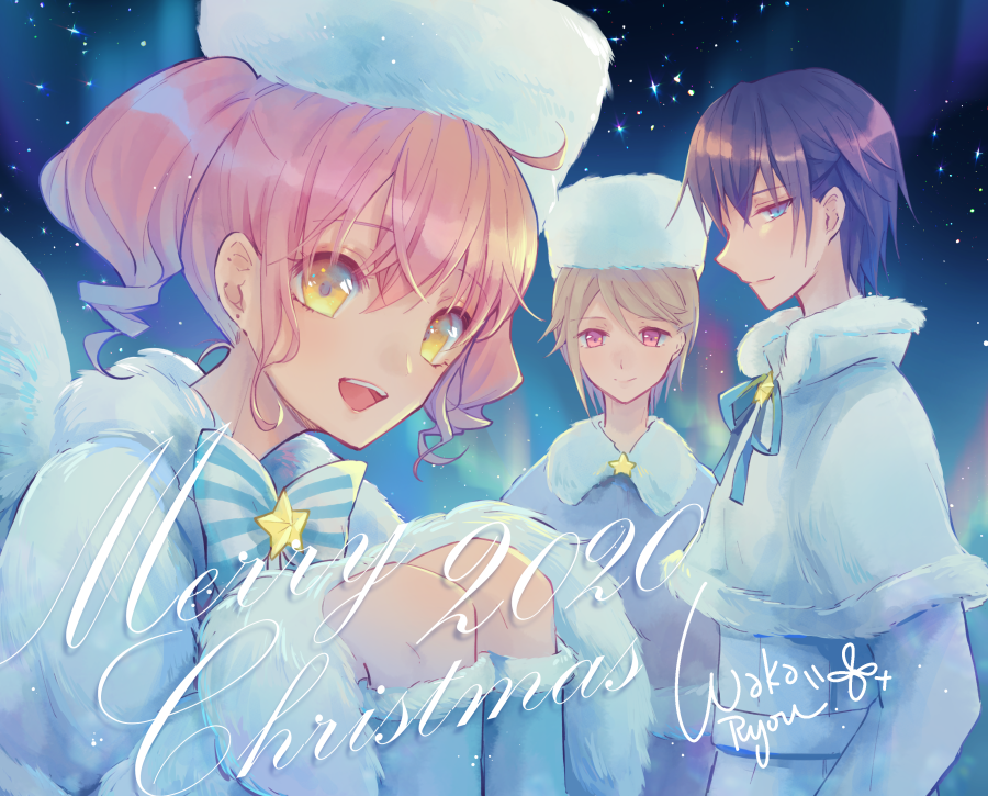 1girl 2020 2boys aurora blonde_hair blue_capelet blue_eyes blue_footwear blue_pants blue_shirt capelet facing_to_the_side facing_viewer fur-trimmed_capelet fur_trim hinamori_amu hotori_tadase looking_at_viewer merry_christmas multiple_boys night pants pink_eyes pink_hair purple_hair shirt shugo_chara! signature sky star_(sky) star_(symbol) starry_sky tsukiyomi_ikuto twintails waka_ryou yellow_eyes