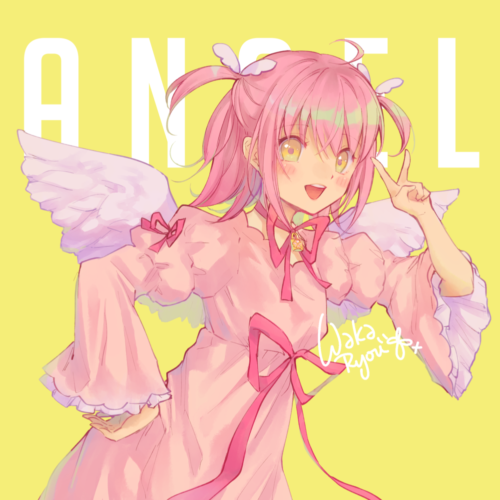 1girl amulet_angel angel angel_wings blush dress feathered_wings half_updo hinamori_amu humpty_lock_(shugo_chara!) jewelry long_sleeves necklace open_mouth pink_dress pink_hair pink_ribbon ribbon short_twintails shugo_chara! signature smile solo twintails v waka_ryou wings yellow_eyes