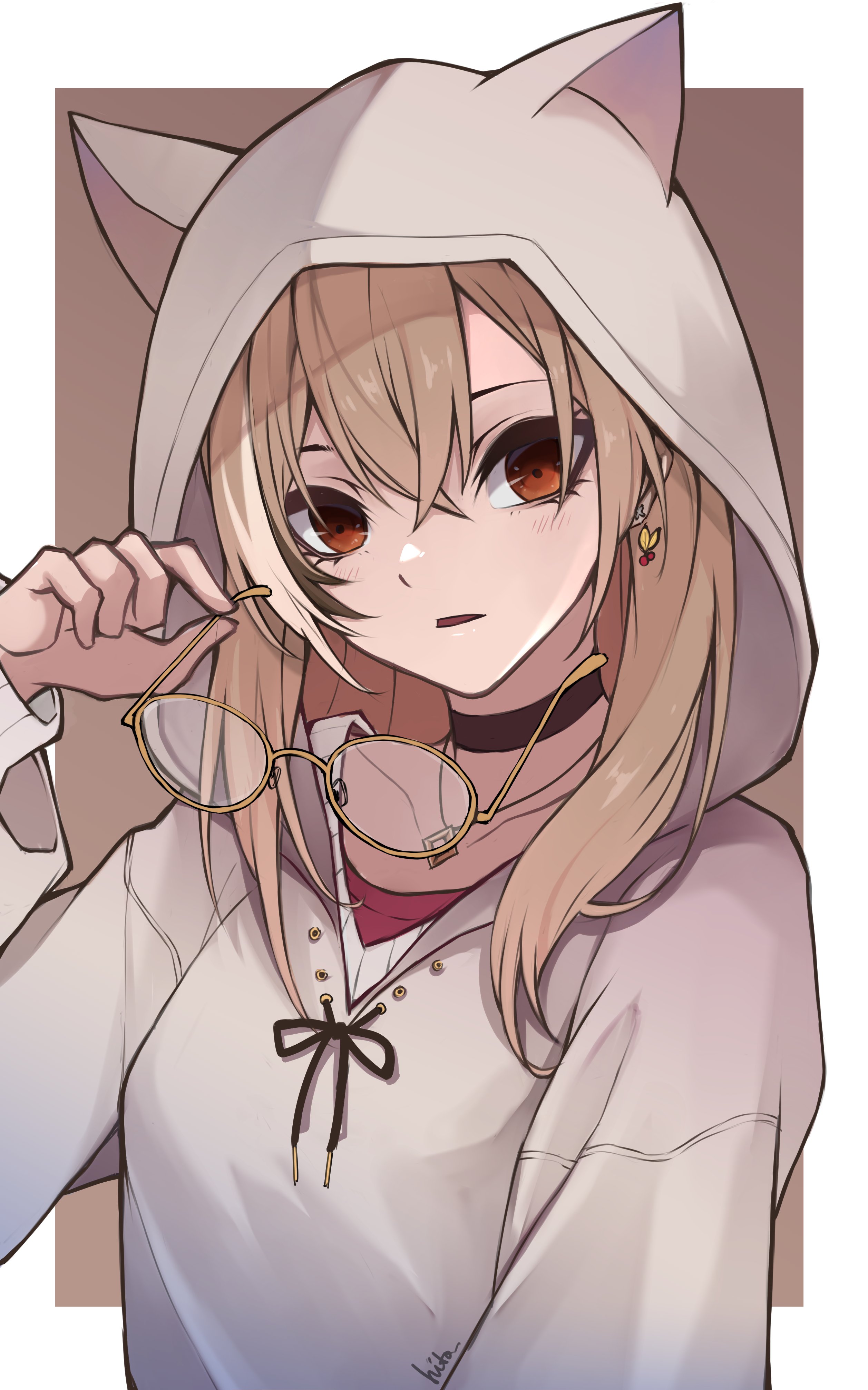 1girl absurdres animal_hood berry black_choker brown_eyes brown_hair brown_hoodie choker crossed_bangs earrings ears_through_headwear unworn_eyewear food-themed_earrings glasses highres hitozche holding holding_removed_eyewear hololive hololive_english hood hood_up hoodie jewelry long_hair looking_at_viewer multicolored_hair nanashi_mumei nanashi_mumei_(casual) necklace official_alternate_costume open_mouth oversized_clothes red_shirt round_eyewear runes shirt simple_background streaked_hair sweater virtual_youtuber white_sweater