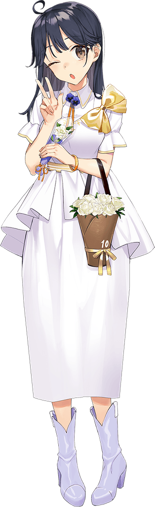 1girl ahoge ankle_boots black_hair boots brown_eyes dress drew_(drew213g) flower full_body high_heel_boots high_heels kantai_collection long_hair official_art one_eye_closed open_mouth purple_boots short_sleeves solo transparent_background ushio_(10th_anniversary)_(kancolle) ushio_(kancolle) v white_dress white_flower