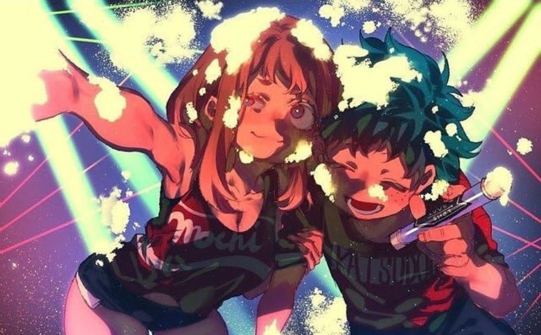 1boy 1girl blue_background boku_no_hero_academia brown_eyes brown_hair couple dekucha_kawaii food green_eyes green_hair midoriya_izuku mochi night non-web_source party purple_background ship sparkle split_mouth uraraka_ochako watercraft