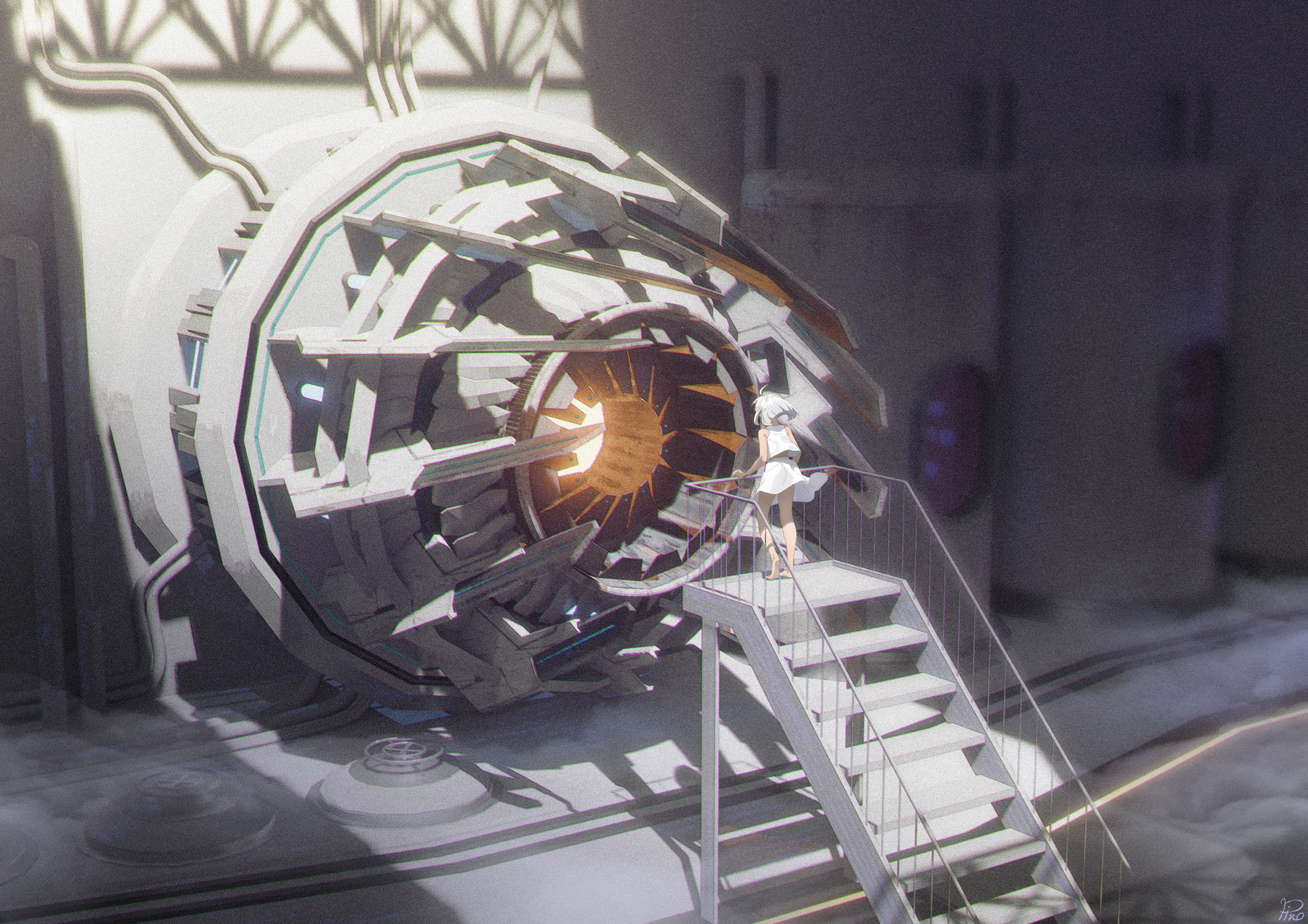 1girl highres machinery original pinoj0214 railing scenery science_fiction shirt short_hair skirt solo stairs standing turbine valve white_hair white_shirt white_skirt