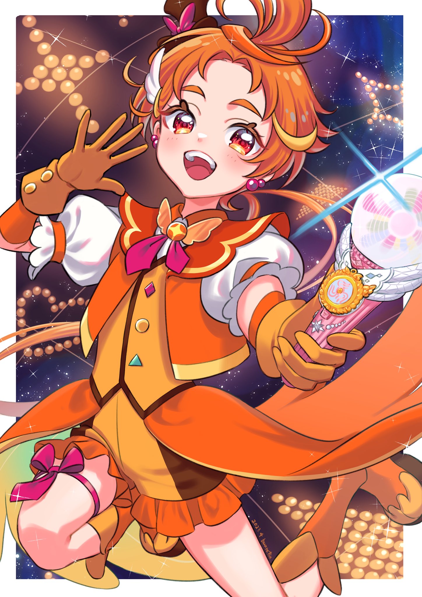 1boy boots brooch bun_(jewd5385) cure_wing earrings hair_ornament highres hirogaru_sky!_precure jewelry leg_ribbon long_hair magical_boy male_focus orange_eyes orange_hair parted_bangs precure ribbon shorts sky_mirage solo thigh_ribbon wing_brooch wing_hair_ornament yuunagi_tsubasa