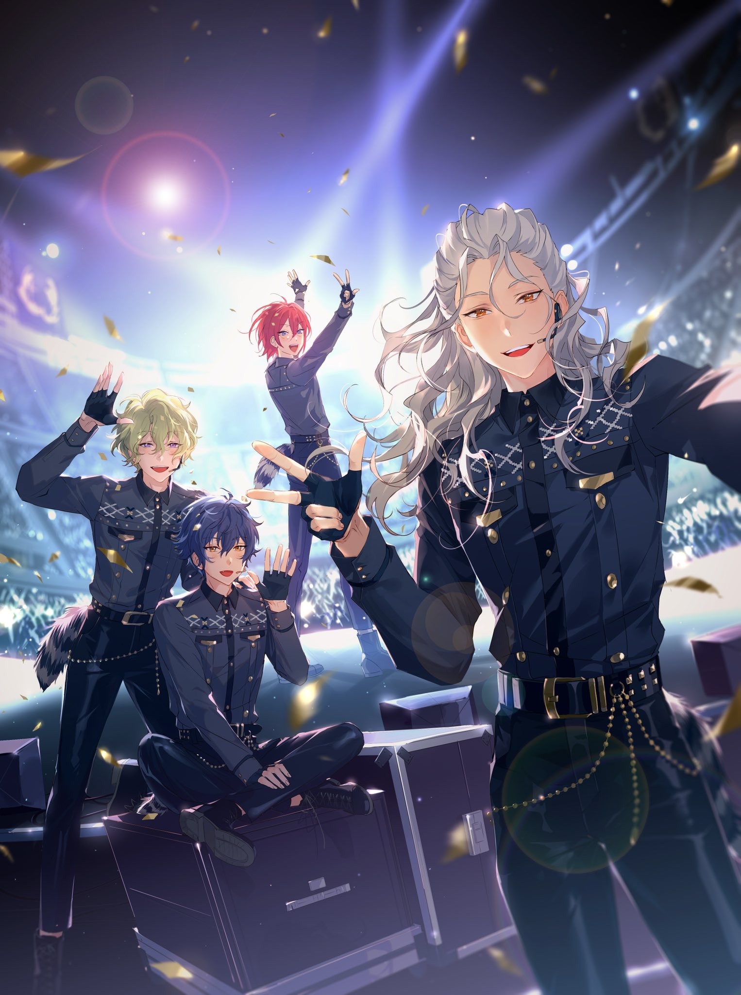 4boys belt black_gloves blue_eyes blue_hair breast_pocket buttons chinese_commentary collared_shirt commentary_request confetti dark_blue_hair eden_(ensemble_stars!) ensemble_stars! unworn_eyewear fingerless_gloves gloves green_hair grey_hair hair_between_eyes hand_on_another's_shoulder highres long_hair long_sleeves male_focus microphone multiple_boys open_mouth orange_eyes pocket purple_eyes purple_hair ran_nagisa rrr_(reason) saegusa_ibara sazanami_jun shirt short_hair sitting standing teeth tomoe_hiyori upper_teeth_only yellow_eyes