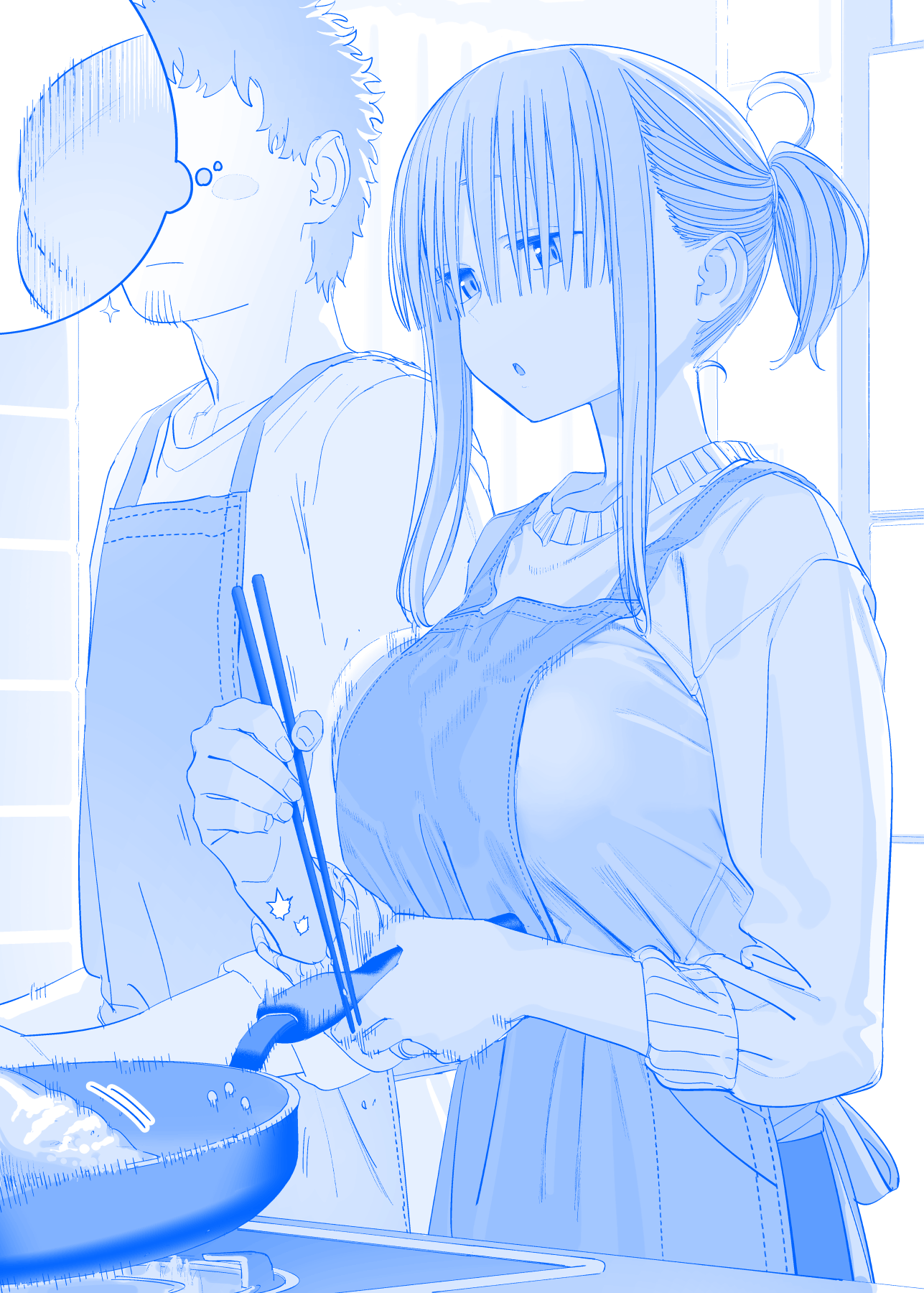 1boy 1girl apron blue_theme blush_stickers bouncing_breasts breasts chopsticks commentary frying_pan getsuyoubi_no_tawawa highres himura_kiseki holding holding_frying_pan large_breasts maegami-chan_(tawawa) monochrome ponytail sensei_(tawawa) short_hair short_ponytail sidelocks speech_bubble stove thought_bubble
