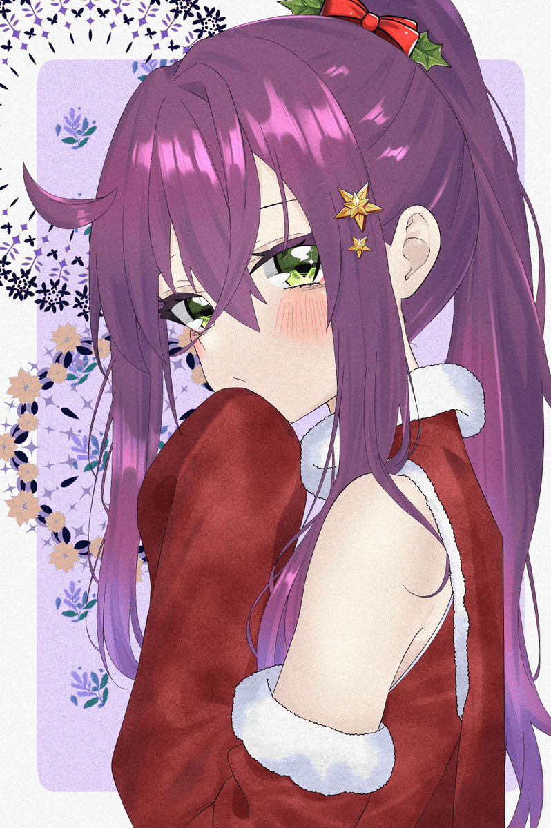 1girl alternate_costume bare_shoulders blush bow christmas_ornaments closed_mouth commentary_request detached_sleeves eyelashes floral_background from_side fur_trim green_eyes hair_ornament hair_ribbon hand_on_own_chin high_ponytail highres long_sleeves looking_at_viewer looking_to_the_side mouri_toushirou_(tenka_hyakken) ponytail purple_hair red_bow ribbon santa_costume sidelocks sleeves_past_fingers sleeves_past_wrists solo star_(symbol) star_hair_ornament star_ornament takimaro320 tenka_hyakken upper_body