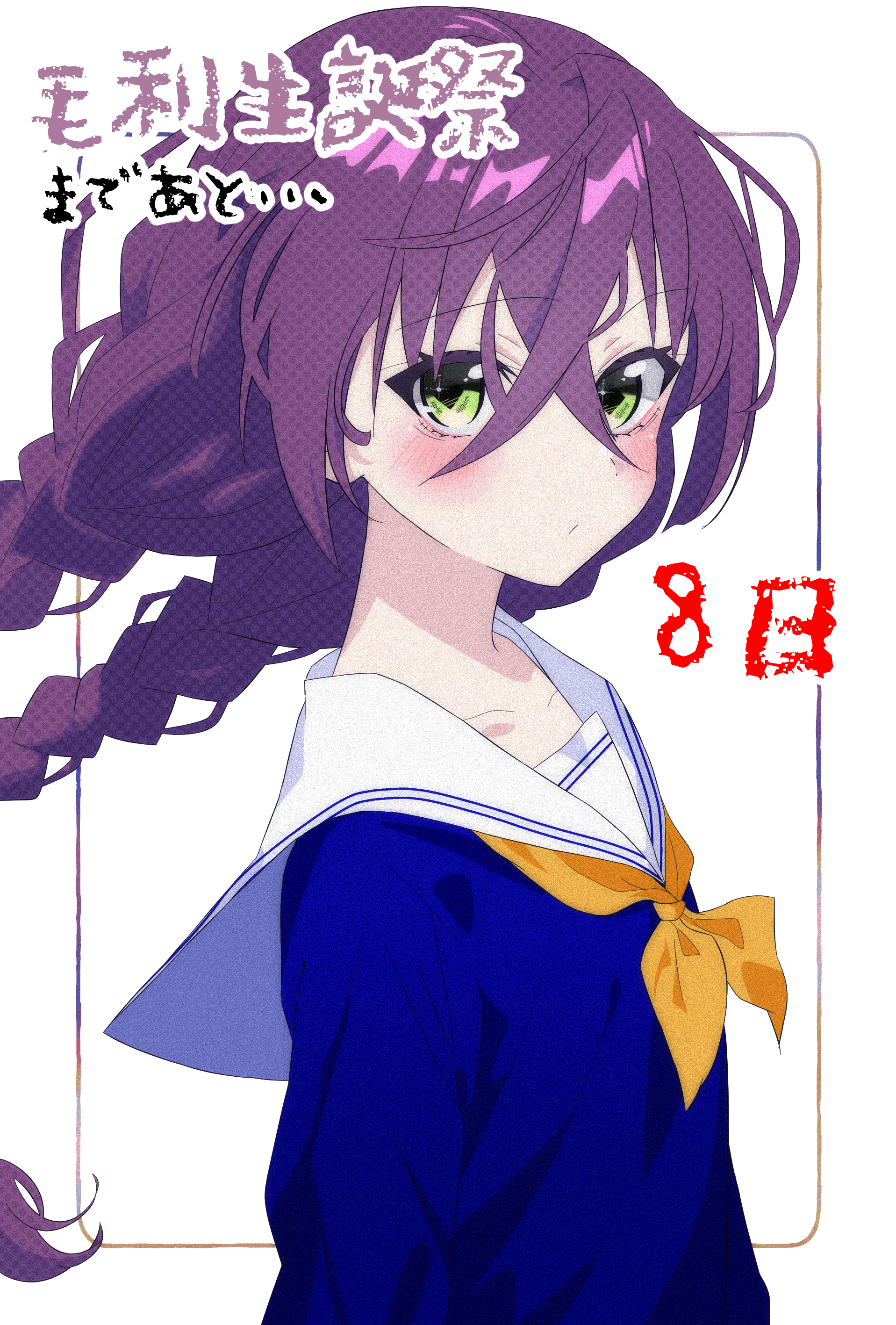 1girl absurdres alternate_costume alternate_hairstyle blue_shirt blue_trim blush braid closed_mouth collarbone commentary_request countdown curly_hair eyelashes from_side green_eyes hair_between_eyes highres japanese_text long_bangs long_hair long_sleeves looking_at_viewer looking_to_the_side mouri_toushirou_(tenka_hyakken) neckerchief purple_hair sailor_collar school_uniform serafuku shirt solo square takimaro320 tenka_hyakken translation_request twin_braids twintails upper_body white_background yellow_neckerchief