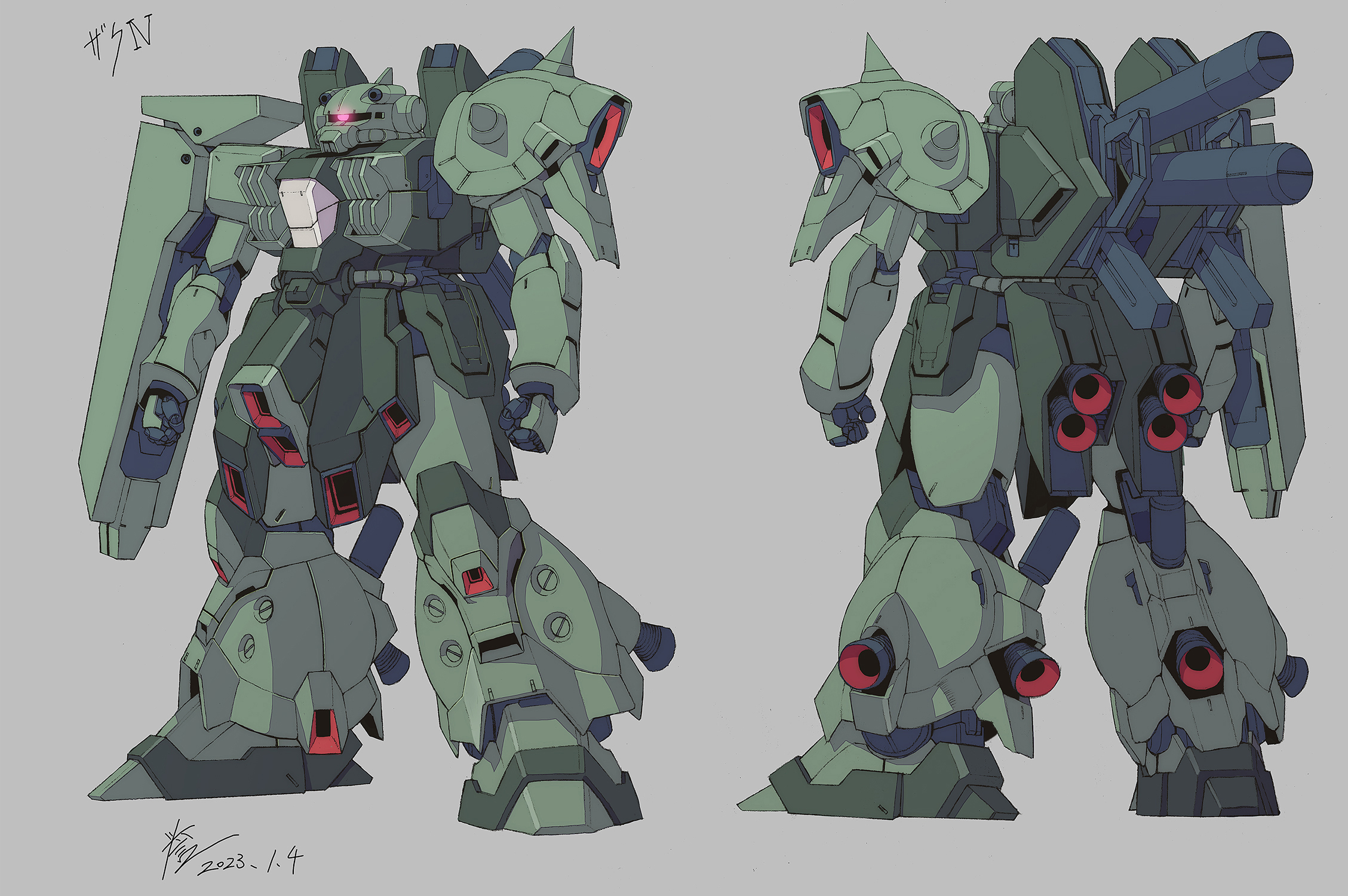 arms_at_sides clenched_hands commentary_request dated glowing glowing_eye grey_background gundam highres homare_(fool's_art) mecha mecha_focus mobile_suit moon_gundam multiple_views no_humans one-eyed red_eyes robot science_fiction shoulder_spikes signature simple_background spikes standing thrusters turnaround zaku_iv