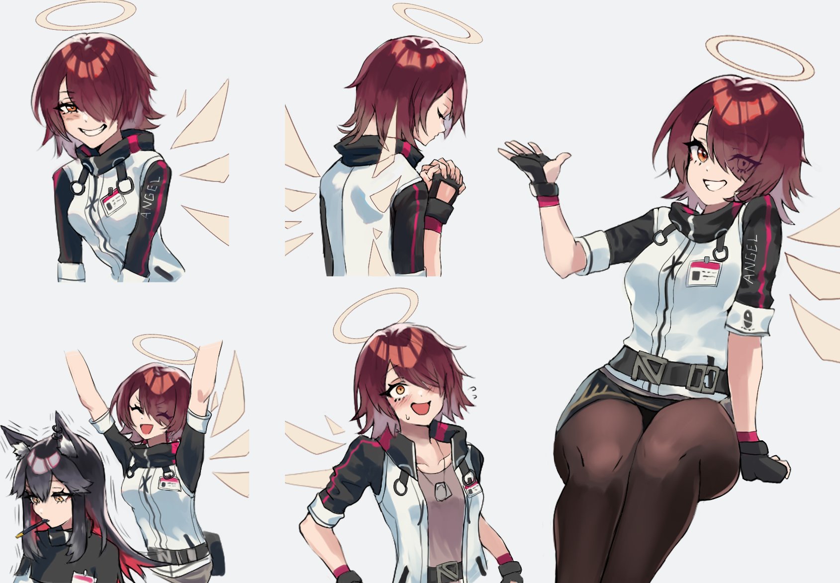 2girls ^_^ animal_ears arknights arms_up belt belt_pouch black_belt black_gloves black_hair blush breasts brown_pantyhose closed_eyes colored_inner_hair commentary detached_wings dog_tags exusiai_(arknights) eyes_visible_through_hair feet_out_of_frame fingerless_gloves food food_in_mouth gloves grey_background grey_shirt grin hair_between_eyes hair_over_one_eye halo highres id_card invisible_chair jacket looking_at_viewer motion_lines mouth_hold multicolored_hair multiple_girls multiple_views open_clothes open_jacket open_mouth orange_eyes own_hands_clasped own_hands_together pantyhose penguin_logistics_logo pocky pocky_in_mouth pouch praying red_eyes red_hair shirt short_hair short_sleeves simple_background sitting small_breasts smile sweatdrop texas_(arknights) white_jacket wide-eyed wings wolf_ears yellow_eyes yoko2yuray