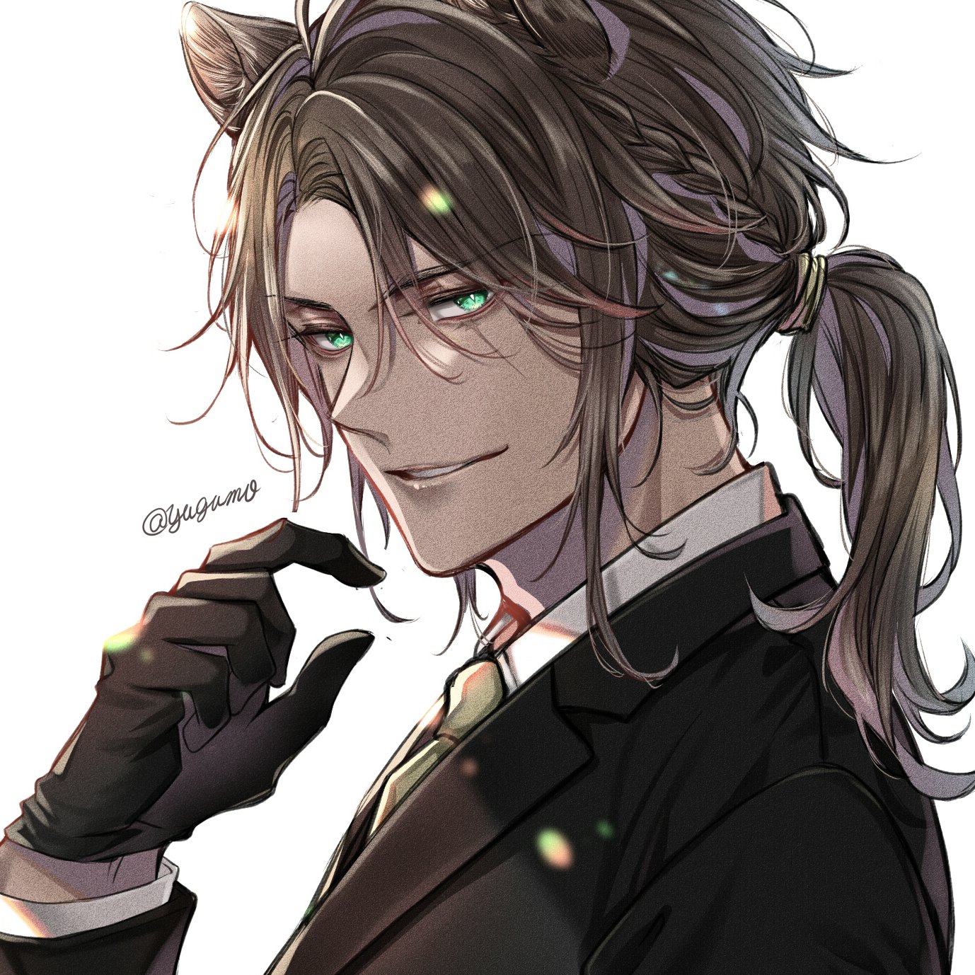 1boy animal_ears black_gloves black_jacket braid brown_hair collared_shirt dark-skinned_male dark_skin formal_clothes from_side gloves green_eyes highres jacket leona_kingscholar lion_ears long_hair looking_at_viewer low_ponytail male_focus necktie ponytail shirt simple_background smile solo suit twisted_wonderland twitter_username white_background white_shirt yugumotwst