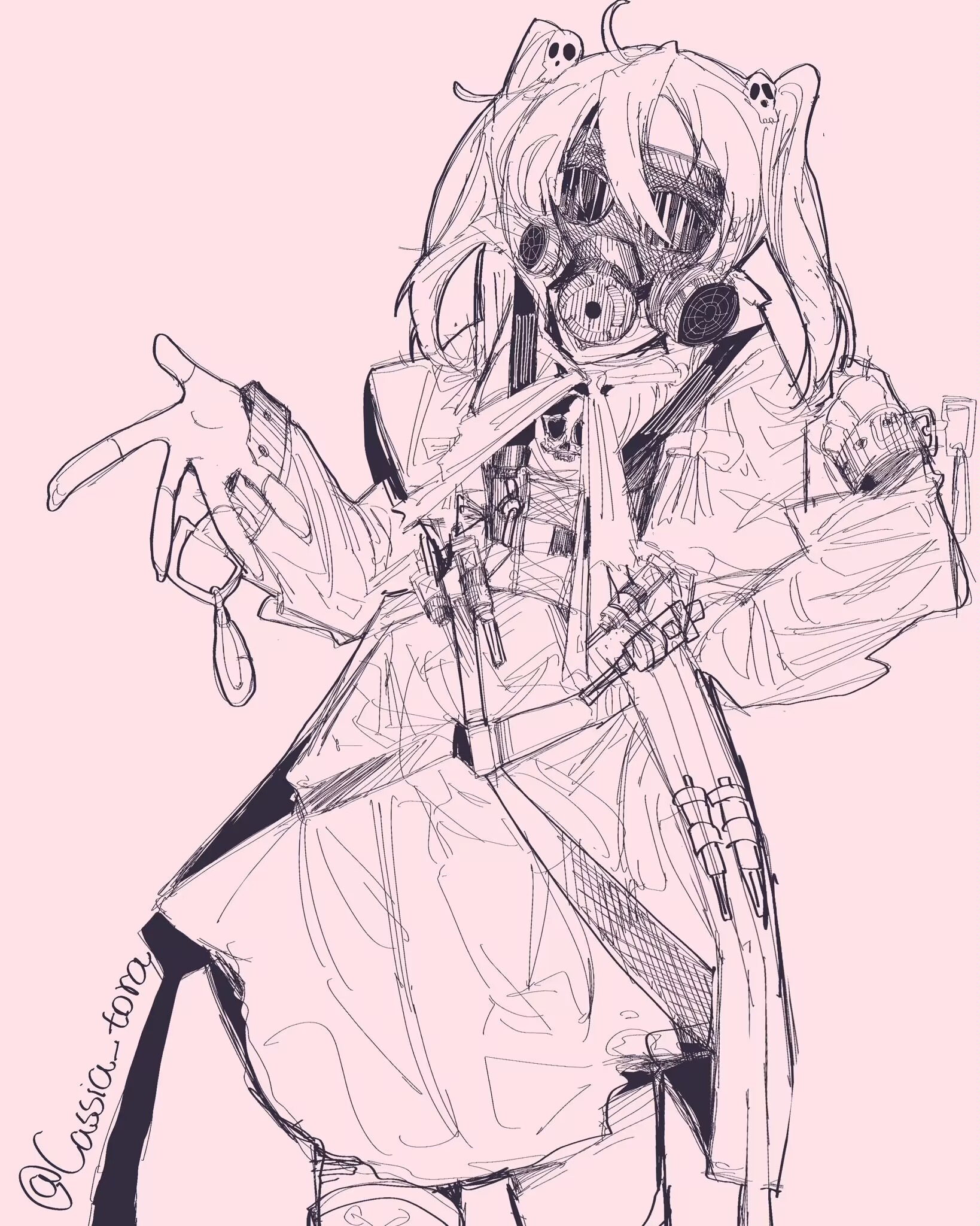 1girl ahoge cassia_tora cowboy_shot dress fingerless_gloves gas_mask gloves hair_ornament hand_up highres lineart mahou_shoujo_magical_destroyers mask monochrome pink_(magical_destroyers) pink_background simple_background sketch skull_hair_ornament solo syringe thighhighs twintails twitter_username wrist_belt wristband