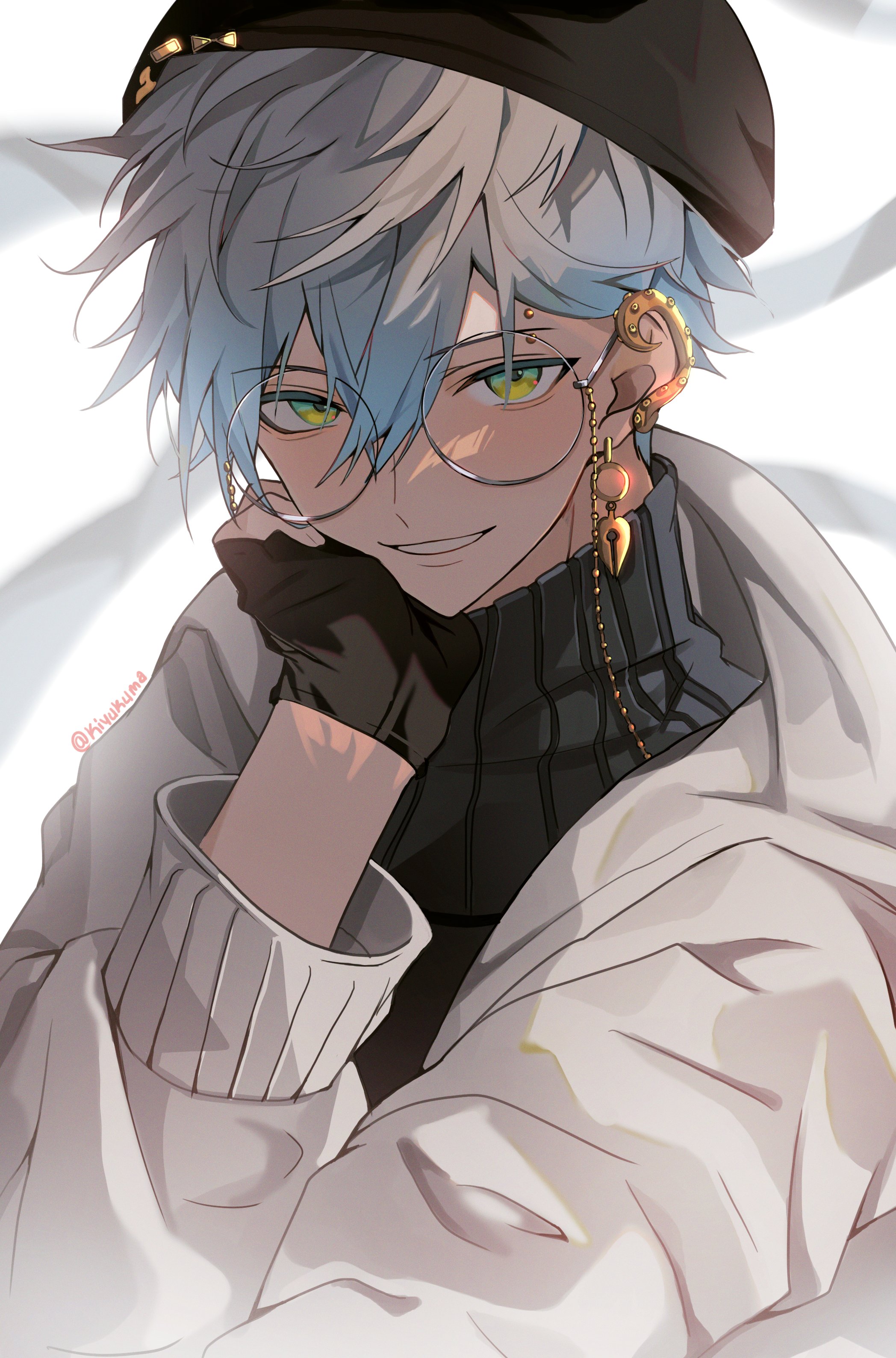 1boy absurdres beret black_gloves black_hat black_shirt blue_hair cardigan earrings eyebrow_piercing eyewear_strap face_piercing fingerless_gloves glasses gloves green_eyes grey_hair grin hair_between_eyes hand_up hat head_rest highres hoop_earrings ike_eveland ike_eveland_(2nd_costume) jewelry kiyukumaa long_sleeves looking_at_viewer male_focus nijisanji nijisanji_en official_alternate_costume piercing round_eyewear shirt simple_background smile solo teeth turtleneck twitter_username upper_body virtual_youtuber white_background white_cardigan