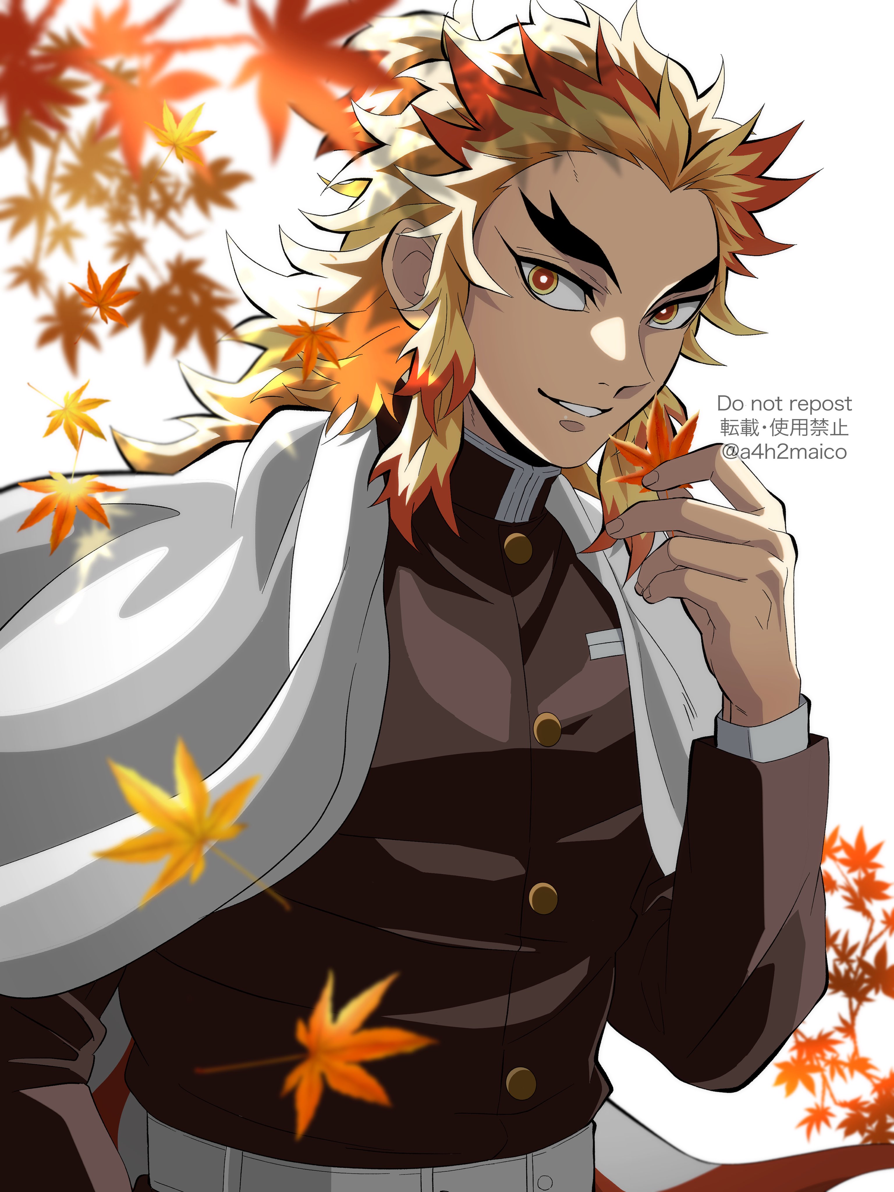 1boy a4h2maico absurdres autumn autumn_leaves blonde_hair cape colored_tips demon_slayer_uniform facing_viewer flame_print forked_eyebrows hand_up highres holding holding_leaf kimetsu_no_yaiba leaf long_hair long_sleeves male_focus multicolored_hair red_hair rengoku_kyoujurou smile solo standing streaked_hair twitter_username upper_body watermark white_background white_cape