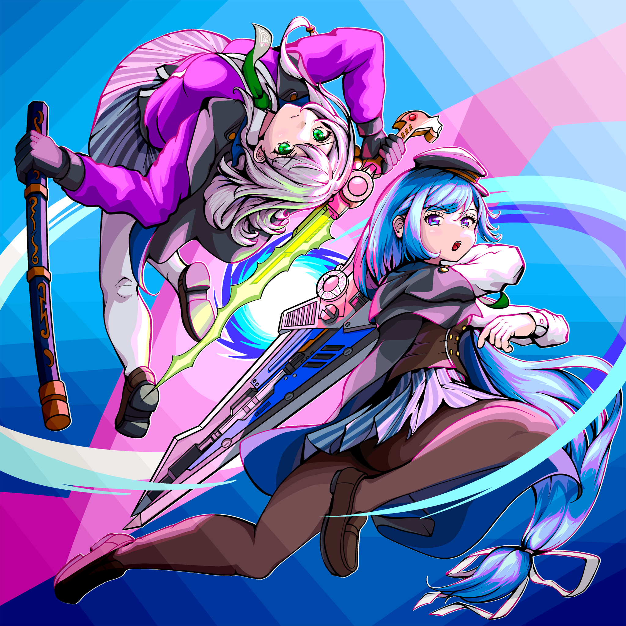 2girls assault_lily black_cape black_gloves black_headwear black_skirt blue_background blue_cape blue_hair breasts brown_footwear brown_pantyhose brown_vest buttons cape cardigan closed_mouth collared_shirt commentary_request emblem floating_hair full_body gloves gradient_background green_eyes green_necktie grey_hair grey_skirt hair_ribbon hands_up hat hidai_miyazu highres holding holding_behind_back holding_sheath holding_sword holding_sword_behind_back holding_weapon holding_weapon_behind_back leaning_back loafers long_hair long_sleeves looking_at_viewer low-tied_long_hair medium_breasts midair miniskirt multiple_girls necktie nifu_(nixets) open_mouth outstretched_leg pantyhose peaked_cap pink_background pleated_skirt purple_cardigan purple_eyes ribbon scabbard school_uniform sheath shirt shoe_soles shoes skirt striped_clothes striped_skirt sword teeth tilted_headwear two-sided_cape two-sided_fabric two-tone_skirt upper_teeth_only upside-down v-shaped_eyebrows vertical-striped_clothes vertical-striped_skirt very_long_hair vest weapon white_pantyhose white_ribbon white_shirt yoshii_kasumiko
