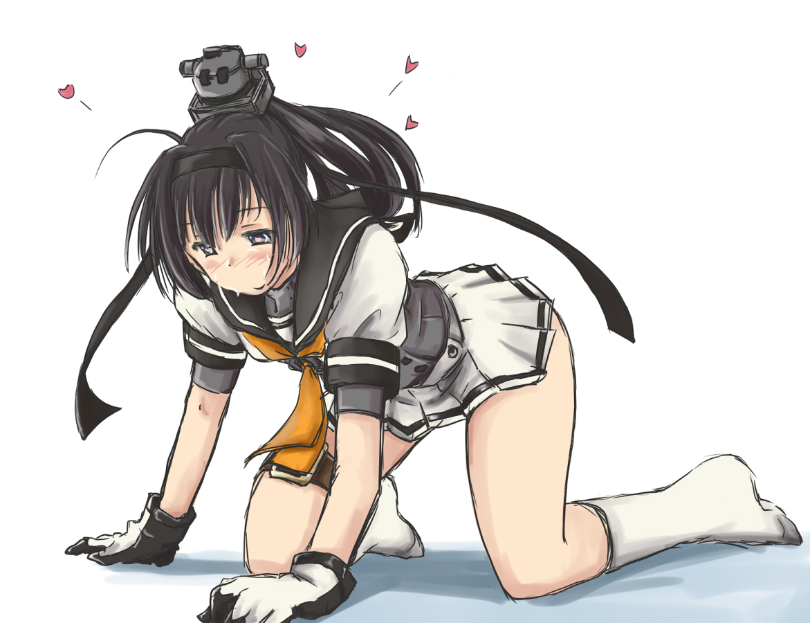 1girl ahoge akizuki_(kancolle) all_fours black_hair black_sailor_collar corset full_body gloves grey_eyes hachimaki headband headgear kantai_collection masamori_ikemo neckerchief pleated_skirt ponytail sailor_collar school_uniform serafuku simple_background skirt socks solo sweat two-tone_gloves white_background white_skirt white_socks yellow_neckerchief
