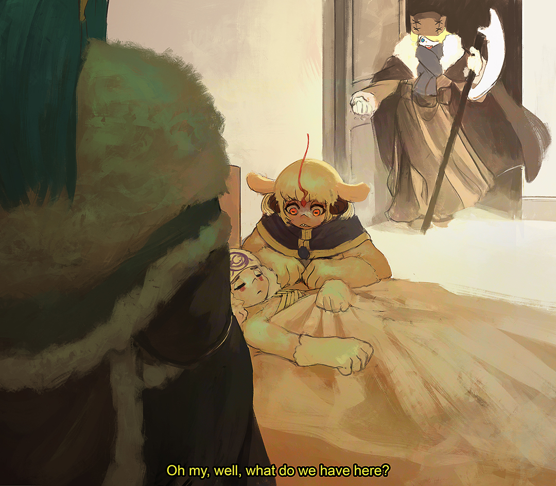 animal_ears bob_(wafferscotch) comic commentary english_commentary english_text faure_(wafferscotch) fur_trim halberd multiple_girls opening_door original penelope_(wafferscotch) polearm simple_background standing wafferscotch weapon