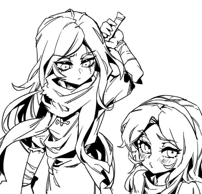 2girls :/ bandaged_arm bandages blush greyscale holding holding_weapon katarina_(league_of_legends) league_of_legends long_hair long_sleeves looking_at_another looking_at_viewer lux_(league_of_legends) monochrome multiple_girls phantom_cross puckered_lips scar scar_across_eye scar_on_face scarf short_sleeves simple_background weapon weapon_on_back white_background