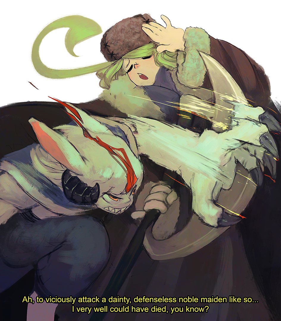 ahoge animal_ears attack claws clenched_teeth coat comic commentary cowboy_shot english_commentary english_text faure_(wafferscotch) fur_hat fur_trim furrowed_brow halberd hat huge_ahoge multiple_girls original polearm scowl sheep_girl simple_background standing teeth ushanka wafferscotch weapon