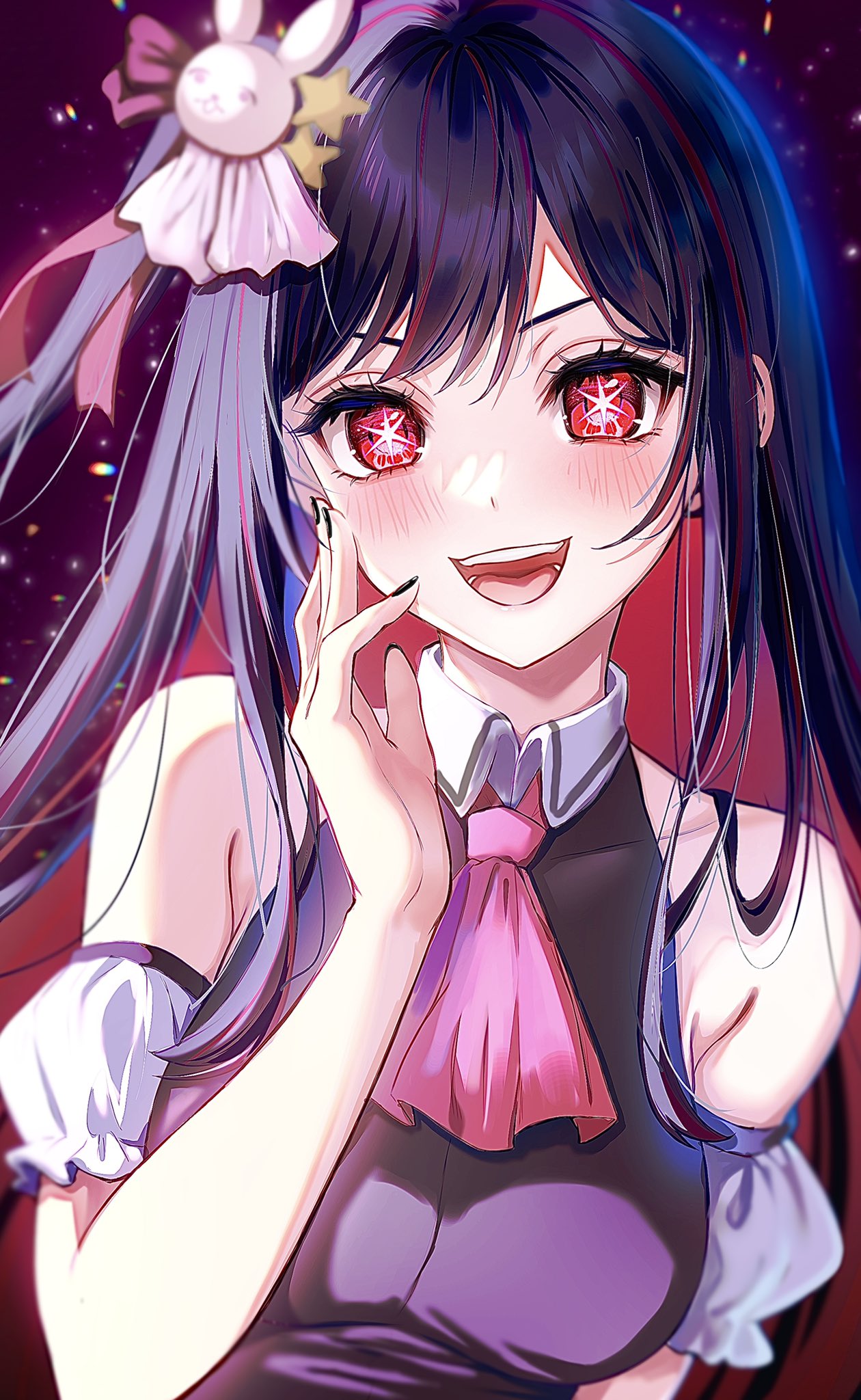 1girl alternate_color alternate_eye_color alternate_hair_color ascot bare_shoulders black_hair black_nails blush commentary detached_sleeves dress hair_ornament highres hoshino_ai idol kurosaki_coco long_hair open_mouth oshi_no_ko pink_ascot purple_dress rabbit_hair_ornament red_eyes solo star-shaped_pupils star_(symbol) symbol-shaped_pupils