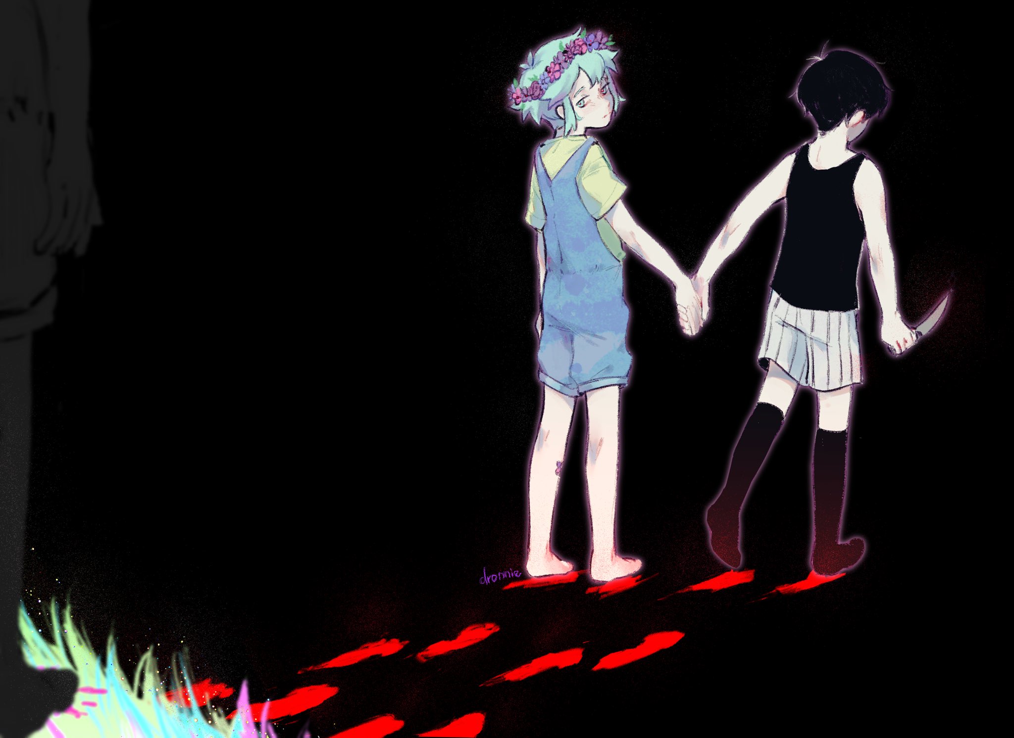 1girl 2boys barefoot basil_(headspace)_(omori) basil_(omori) black_hair black_socks bloody_footprints blue_overalls closed_mouth colored_skin dronnie facing_away flower footprints green_eyes green_hair green_shirt head_wreath highres holding holding_knife knife looking_at_another mari_(omori) multiple_boys omori omori_(omori) overall_shorts overalls sad shirt short_hair short_sleeves socks spoilers white_skin