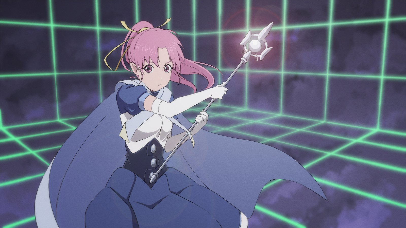 1girl anime_coloring breasts cape closed_mouth elbow_gloves gloves hair_ribbon highres holding holding_staff kaien_advance long_hair looking_at_viewer medium_breasts millie_chliette official_style pink_eyes pink_hair pointy_ears ponytail ribbon solo staff star_ocean star_ocean:_first_departure weapon white_gloves