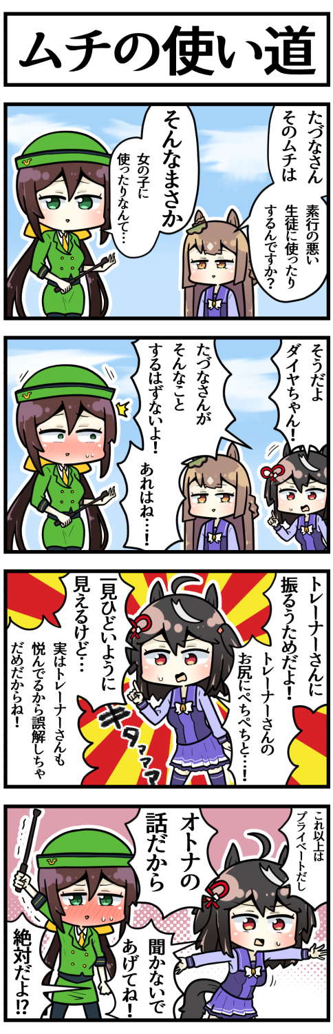 3girls 4koma ^^^ ahoge animal_ears arm_up black_hair blush bow bowler_hat bowtie brown_hair comic commentary_request digging_your_own_grave ear_ornament formal_clothes green_headwear green_jacket grey_hair hair_between_eyes hair_bow hat hayakawa_tazuna highres holding holding_riding_crop horse_ears horse_girl horse_tail horseshoe_hat_ornament horseshoe_ornament index_finger_raised jacket kitasan_black_(umamusume) light_brown_hair long_hair long_sleeves low_ponytail medium_hair motion_lines multicolored_hair multiple_girls orange_eyes outline pink_background pleated_skirt ponytail purple_sailor_collar purple_shirt purple_skirt purple_thighhighs red_eyes riding_crop sailor_collar sailor_shirt sakai_waka satono_diamond_(umamusume) school_uniform shirt sideways_glance skirt skirt_suit sky sound_effects speech_bubble spread_legs streaked_hair suit suit_jacket sunburst sunburst_background sweatdrop tail thighhighs tracen_school_uniform translation_request trembling two-tone_hair two_side_up umamusume unconventional_sound_effect very_long_hair white_bow white_bowtie winter_uniform yellow_bow