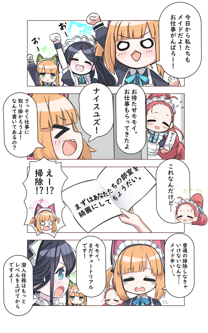 >_< 4girls 4koma :3 :d absurdly_long_hair alternate_costume animal_ear_headphones animal_ears apron aris_(blue_archive) aris_(maid)_(blue_archive) arm_up black_hair blue_archive blue_bow blue_bowtie blue_eyes blunt_bangs bow bowtie cat_ear_headphones cat_ears comic commentary_request enmaided fake_animal_ears flying_sweatdrops forehead hair_ribbon halo headphones holding holding_paper long_hair long_sleeves looking_at_another looking_at_viewer maid maid_apron maid_headdress midori_(blue_archive) midori_(maid)_(blue_archive) momoi_(blue_archive) momoi_(maid)_(blue_archive) multiple_girls official_alternate_costume official_alternate_hairstyle one_side_up open_mouth orange_hair paper parted_bangs ponytail raised_fist red_hair ribbon shooka short_hair short_sleeves side_ponytail sidelocks smile sweatdrop translation_request very_long_hair xd yuzu_(blue_archive) yuzu_(maid)_(blue_archive)